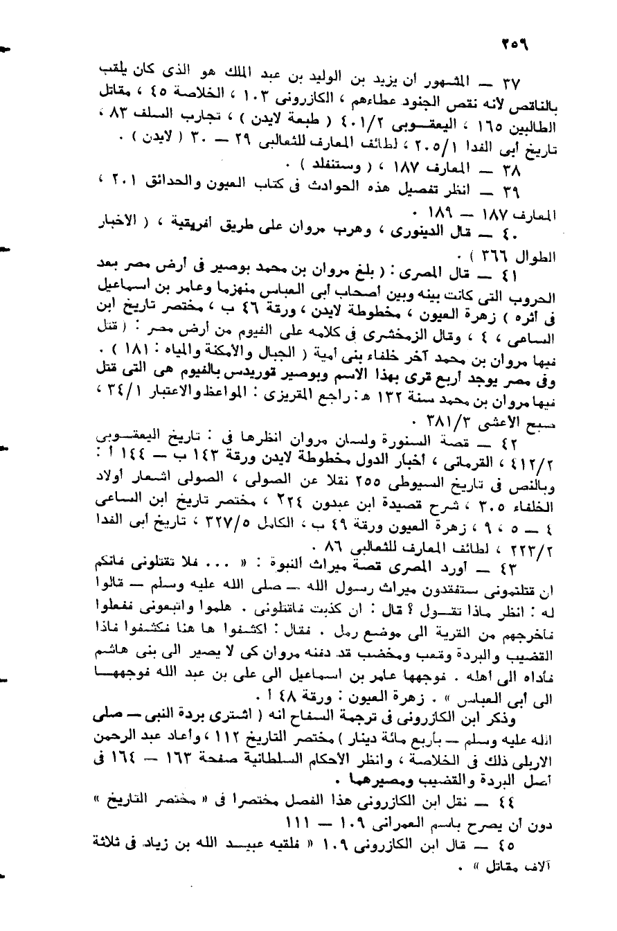 «41» - قال المصري: (بلغ مروان بن محمد بوصير في أرض مصر بعد الحروب التي كانت بينه وبين أصحاب أبى العباس منهزما وعامر بن إسماعيل في أثره) زهرة العيون، مخطوطة لايدن، ورقة 46 ب، مختصر تاريخ ابن الساعي، 4، وقال الزمخشريّ في كلامه على الفيوم من أرض مصر: (قتل فيها مروان بن محمد آخر خلفاء بنى أمية (الجبال والأمكنة والمياه: 181) .