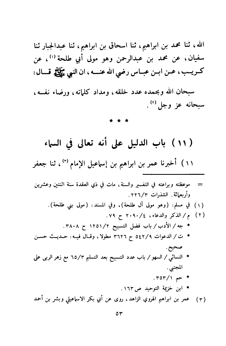 اللَّهُ ثَنَا مُحَمَّدُ بْنُ إِبْرَاهِيمَ ثَنَا إِسْحَاقُ بْنُ إِبْرَاهِيمَ ثَنَا عَبْدُ الْجَبَّارِ ثَنَا سُفْيَانُ عَنْ مُحَمَّدِ بْنِ عَبْدِ الرَّحْمَنِ وَهُوَ مَوْلَى أَبِي طَلْحَةَ عَنْ كُرَيْبٍ عَنِ ابْنِ عَبَّاسٍ رَضِيَ اللَّهُ عَنْهُ أَنّ النَّبِيَّ صَلَّى اللَّهُ عَلَيْهِ وَسَلَّمَ قَالَ سُبْحَانَ اللَّهِ وَبِحَمْدِهِ عَدَدَ خَلْقِهِ وَمِدَادَ كَلِمَاتِهِ ورضاء نَفْسِهِ سُبْحَانَهُ عَزَّ وَجَلَّ