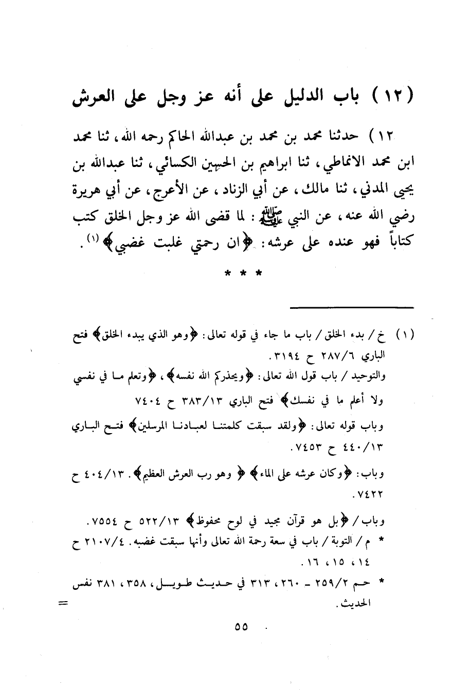 12 - حَدَّثَنَا مُحَمَّدُ بْنُ مُحَمَّدِ بْنِ عَبْدِ اللَّهِ الْحَاكِمُ رَحِمَهُ اللَّهُ ثَنَا مُحَمَّدُ ابْن مُحَمَّدٍ الْأَنْمَاطِيُّ ثَنَا إِبْرَاهِيمُ بْنُ الْحُسَيْنِ الْكِسَائِيُّ ثَنَا عَبْدُ اللَّهِ بْنُ يَحْيَى الْمَدَنِيُّ ثَنَا مَالِكٌ عَنْ أَبِي الزِّنَادِ عَنِ الْأَعْرَجِ عَنْ أَبِي هُرَيْرَةَ رَضِيَ اللَّهُ عَنْهُ عَنِ النَّبِيِّ صَلَّى اللَّهُ عَلَيْهِ وَسَلَّمَ لَمَّا قَضَى اللَّهُ عَزَّ وَجَلَّ الْخَلْقَ كَتَبَ كِتَابًا فَهُوَ عِنْدَهُ عَلَى عَرْشِهِ (إِنَّ رَحْمَتِي غَلَبَتْ غَضَبِي)