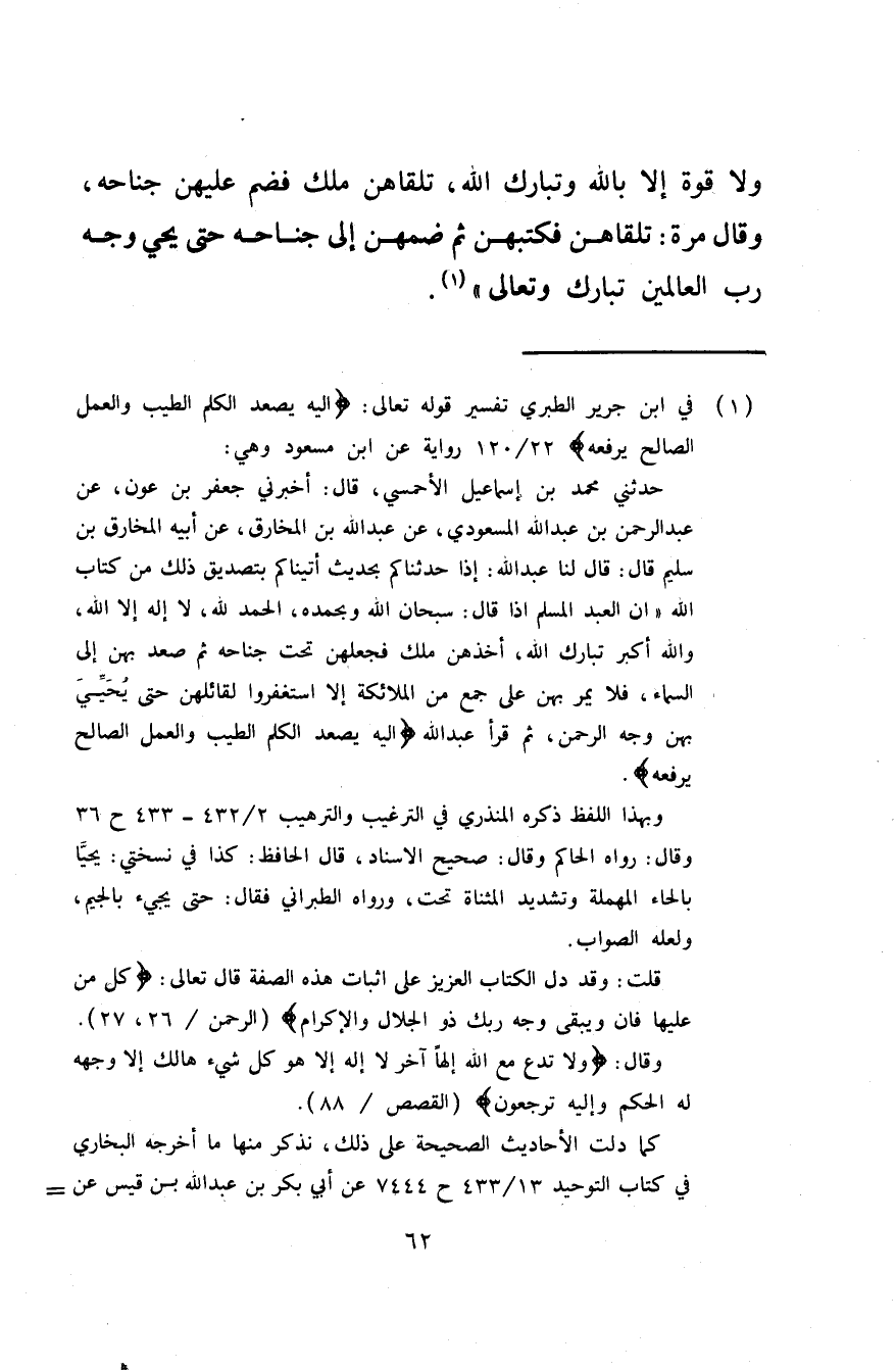 وَلَا قُوَّةَ إِلَّا بِاللَّهِ وَتَبَارَكَ اللَّهُ تَلَقَّاهُنَّ مَلَكٌ فَضَمَّ عَلَيْهِنَّ جَنَاحَهُ وَقَالَ مَرَّةً تَلَقَّاهُنَّ فَكَتَبَهُنَّ ثُمَّ ضَمَّهُنَّ إِلَى جَنَاحِهِ حَتَّى يحي وَجْهَ رَبِّ الْعَالَمِينَ تَبَارَكَ وَتَعَالَى)