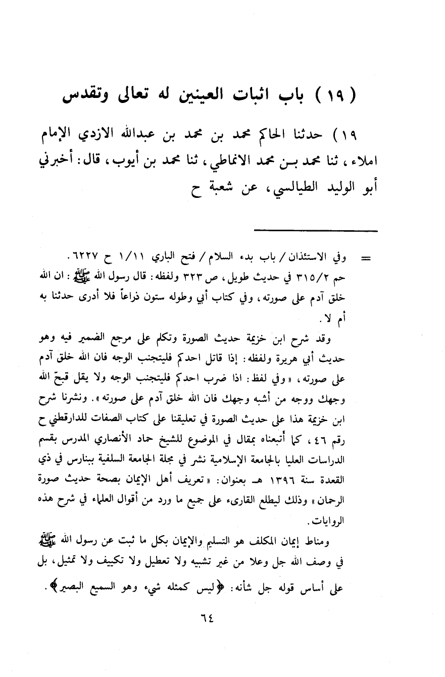 - (19) بَابُ إِثْبَاتِ الْعَيْنَيْنِ لَهِ تَعَالَى وَتَقَدَّسَ)