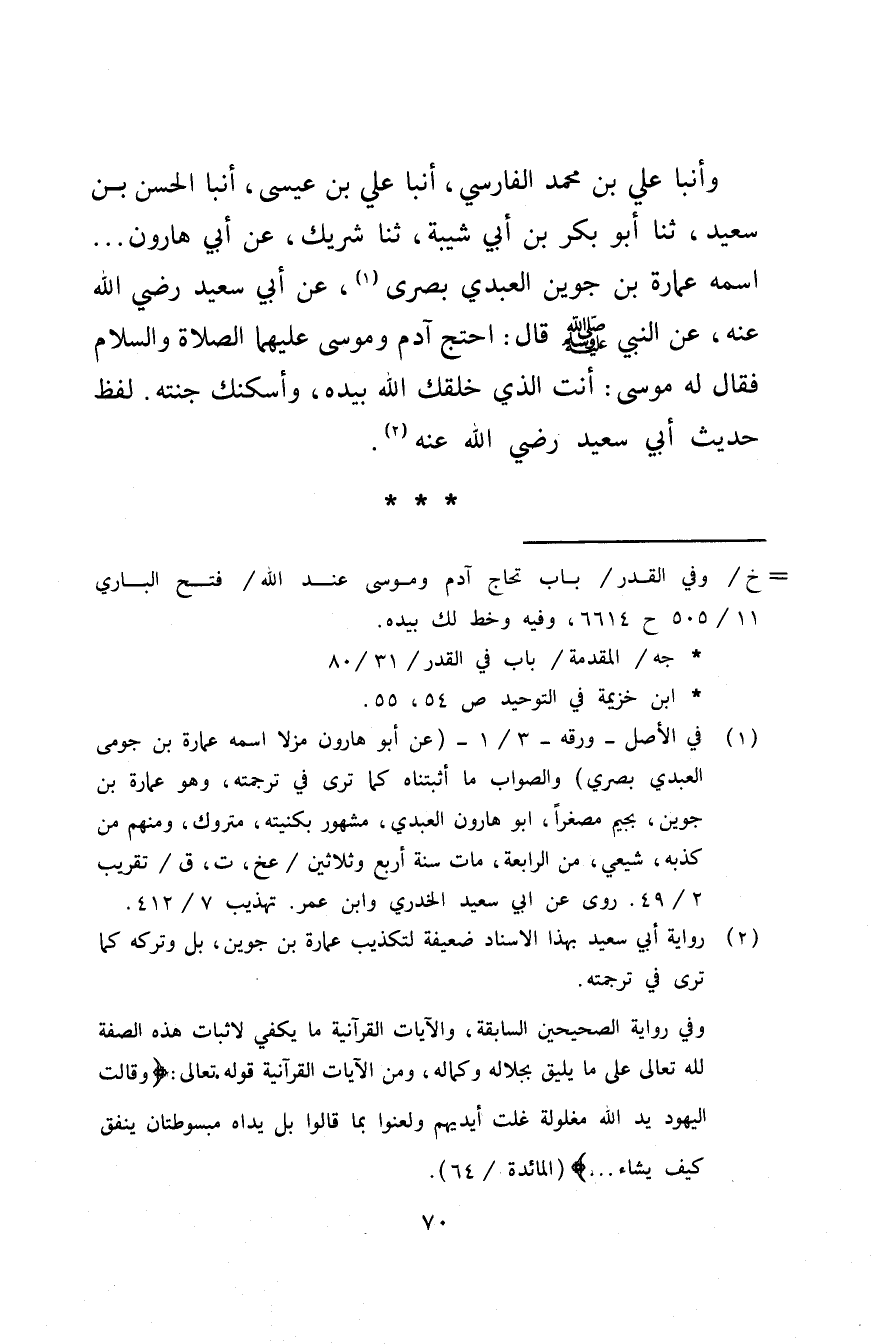 وَأَنْبَأَ عَلِيُّ بْنُ مُحَمَّدٍ الْفَارِسِيُّ أَنْبَأَ عَلِيُّ بْنُ عِيسَى أَنْبَأَ الْحسن بن سعيد ثَنَا أَبُو بَكْرِ بْنُ أَبِي شَيْبَةَ ثَنَا شَرِيكٌ عَنْ أَبِي هَارُون اسْمُهُ عُمَارَةُ بْنُ جُوَيْنٍ الْعَبْدِيُّ بَصْرِيٌّ عَنْ أَبِي سَعِيدٍ رَضِيَ اللَّهُ عَنْهُ عَنِ النَّبِيِّ صَلَّى اللَّهُ عَلَيْهِ وَسَلَّمَ قَالَ احْتَجَّ آدَمُ وَمُوسَى عَلَيْهِمَا الصَّلَاةُ وَالسَّلَامُ فَقَالَ لَهُ مُوسَى أَنْتَ الَّذِي خَلَقَكَ اللَّهُ بِيَدِهِ وَأَسْكَنَكَ جَنَّتَهُ لَفْظُ حَدِيثِ أَبِي سَعِيدٍ رَضِيَ اللَّهُ عَنْهُ