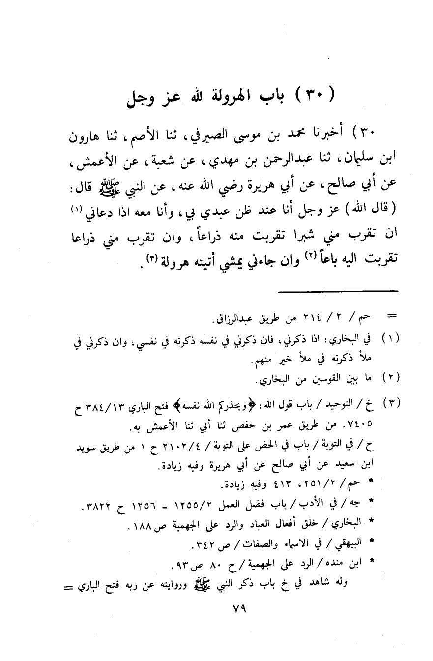 30 - أَخْبَرَنَا مُحَمَّدُ بْنُ مُوسَى الصَّيْرفِيُّ ثَنَا الْأَصَم ثَنَا هَارُون ابْن سُلَيْمَانَ ثَنَا عَبْدُ الرَّحْمَنِ بْنُ مَهْدِيٍّ عَنْ شُعْبَةَ عَنِ الْأَعْمَشِ عَنْ أَبِي صَالِحٍ عَنْ أَبِي هُرَيْرَةَ رَضِيَ اللَّهُ عَنْهُ عَنِ النَّبِيِّ صَلَّى اللَّهُ عَلَيْهِ وَسَلَّمَ قَالَ (قَالَ الله) عَزَّ وَجَلَّ أَنَا عِنْدَ ظَنِّ عَبْدِي بِي وَأَنَا مَعَهُ إِذَا دَعَاني أَن تَقَرَّبَ مِنِّي شِبْرًا تَقَرَّبْتُ مِنْهُ ذِرَاعًا وَإِنْ تَقَرَّبَ مِنِّي ذِرَاعًا تَقَرَّبْتُ إِلَيْهِ بَاعًا وَإِنْ جَاءَنِي يمشي أَتَيْته هَرْوَلَةً