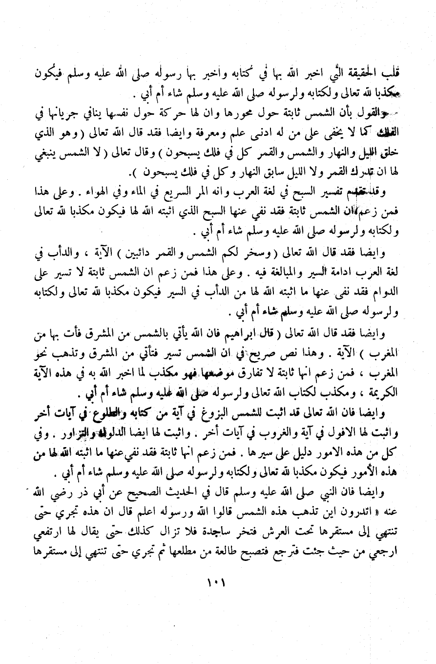 وأيضا فقد قال الله تعالى (وسخر لكم الشمس والقمر دائبين) الآية, والدأب في لغة العرب إدامة السير والمبالغة فيه. وعلى هذا فمن زعم أن الشمس ثابتة لا تسير على الدوام فقد نفى عنها ما أثبته الله لها من الدأب في السير فيكون مكذبا لله تعالى ولكتابه ولرسوله صلى الله عليه وسلم شاء أم أبى.
