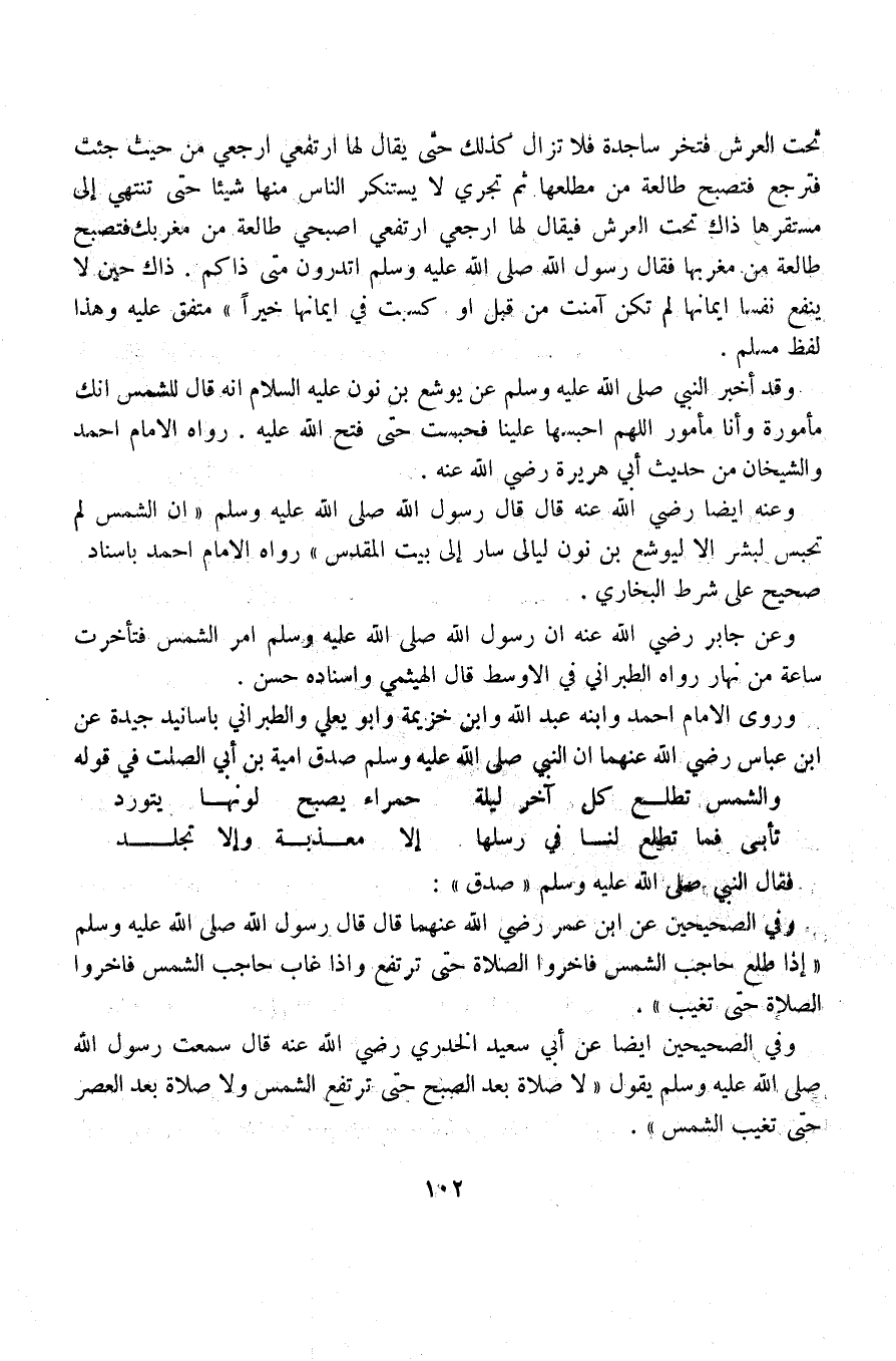 وعنه أيضاً رضي الله عنه قال قال رسول الله صلى الله عليه وسلم «إن الشمس لم تحبس لبشر إلا ليوشع بن نون ليالي سار إلى بيت المقدس» رواه الإمام أحمد بإسناد صحيح على شرط البخاري.