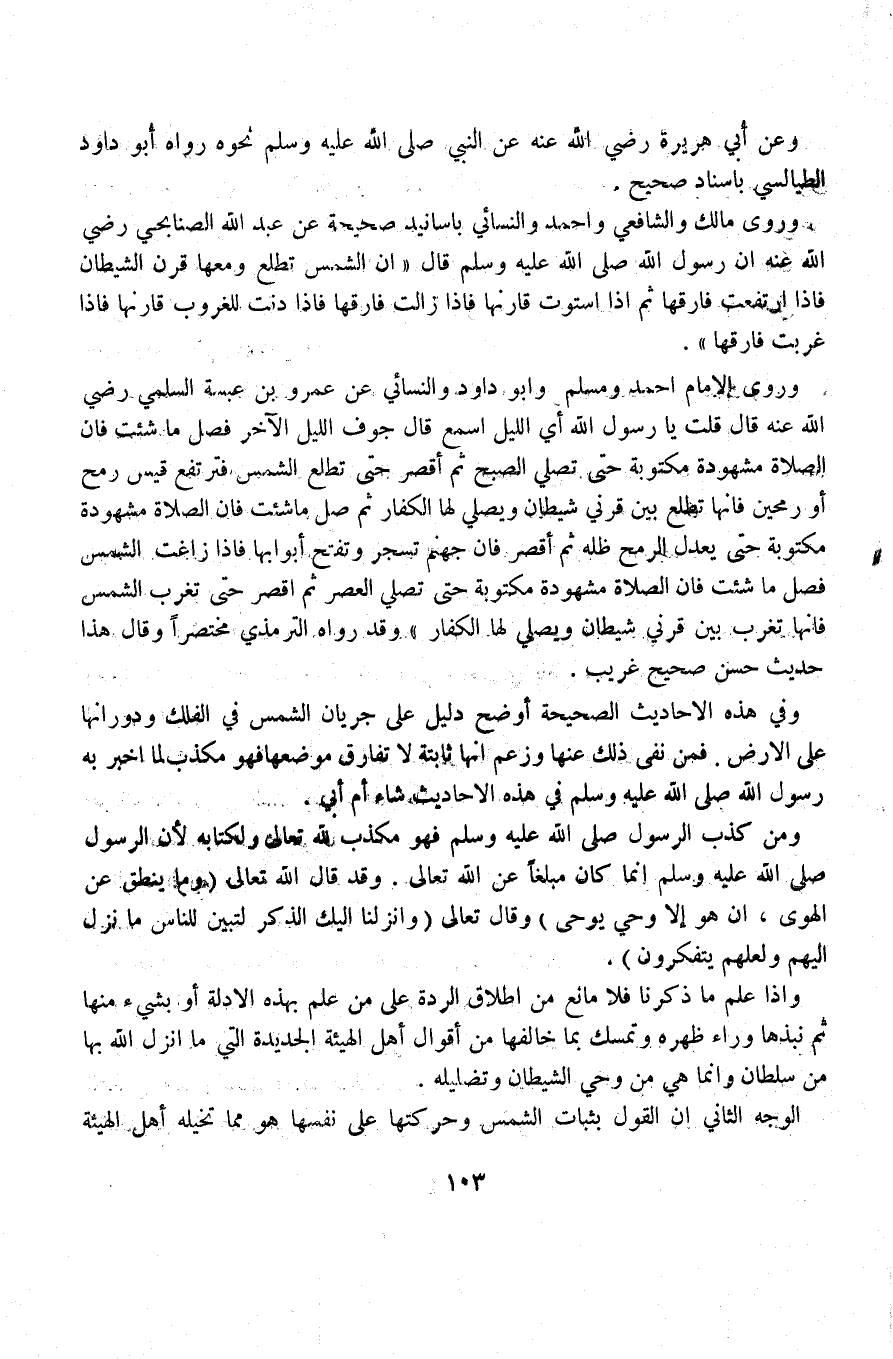 وفي هذه الأحاديث الصحيحة أوضح دليل على جريان الشمس في الفلك ودورانها على الأرض. فمن نفى ذلك عنها وزعم أنها ثابتة لا تفارق موضعها فهو مكذب لما أخبر به رسول الله صلى الله عليه وسلم في هذه الأحاديث شاء أم أبى.