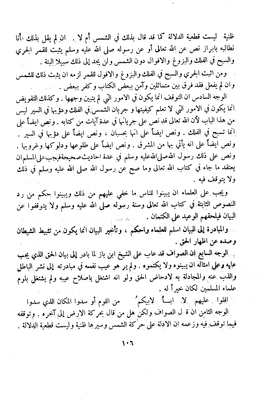 الوجه السادس أن التوقف إنما يكون في الأمور التي لم يتبين وجهها. وكذلك التفويض إنما يكون في الأمور التي لا تعلم كيفيتها وجريان الشمس في الفلك ودؤبها في السير ليس من هذا الباب لأن الله تعالى قد نص على جريانها في عدة آيات من كتابه. ونص أيضاً على أنها تسبح في الفلك. ونص أيضاً على أنها بحسبان. ونص أيضاً على دؤبها في السير.
