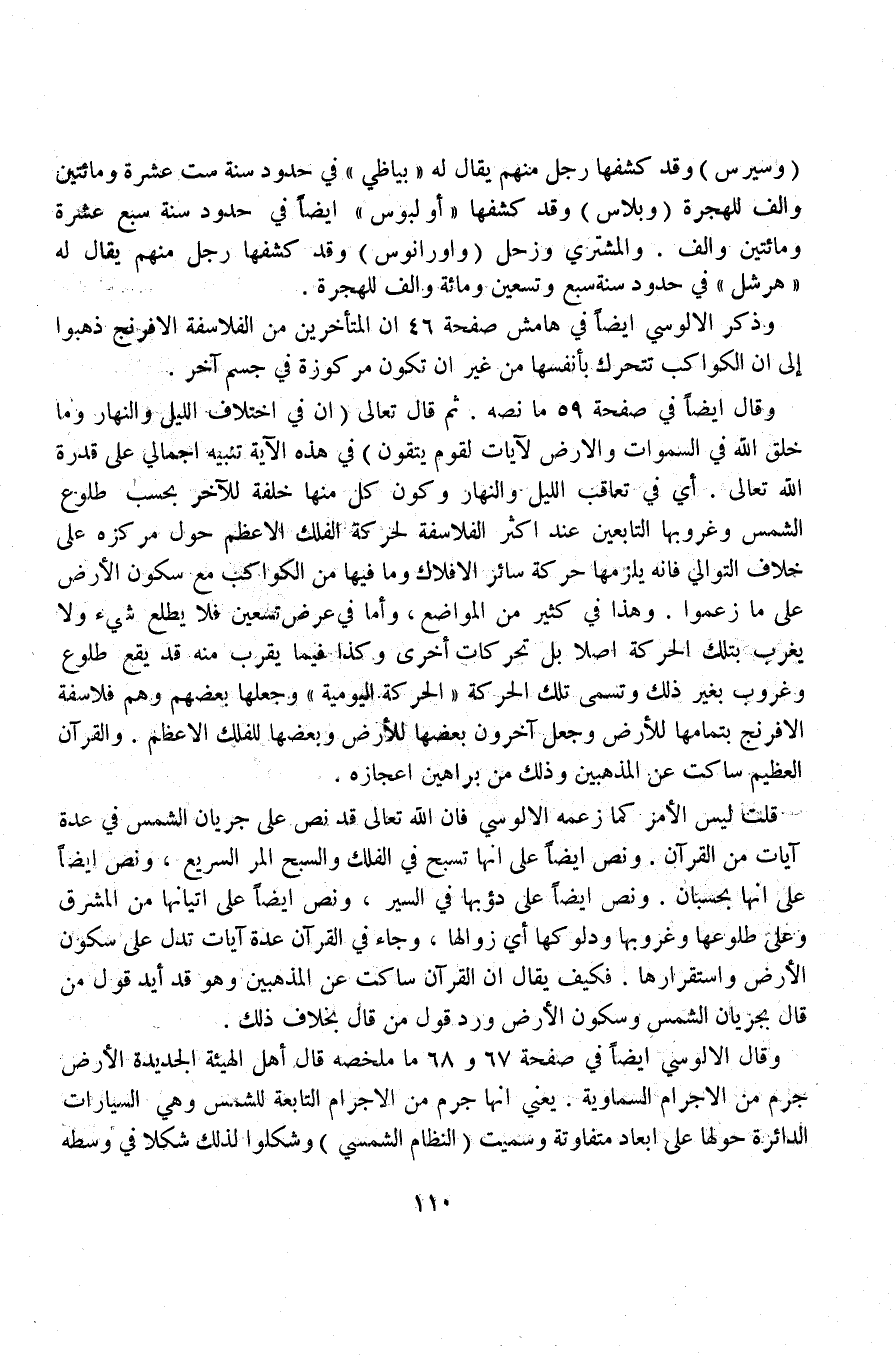 قلت ليس الأمر كما زعمه الألوسي فإن الله تعالى قد نص على جريان الشمس في عدة آيات من القرآن. ونص أيضاً على أنها تسبح في الفلك والسبح المر السريع, ونص أيضاً على أنها بحسبان. ونص أيضاً على دؤبها في السير, ونص أيضاً على إتيانها من المشرق وعلى طلوعها وغروبها ودلوكها أي زوالها, وجاء في القرآن عدة آيات تدل على سكون الأرض واستقرارها. فكيف يقال إن القرآن ساكت عن المذهبين وهو قد أيد قول من قال بجريان الشمس وسكون الأرض ورد قول من قال بخلاف ذلك.