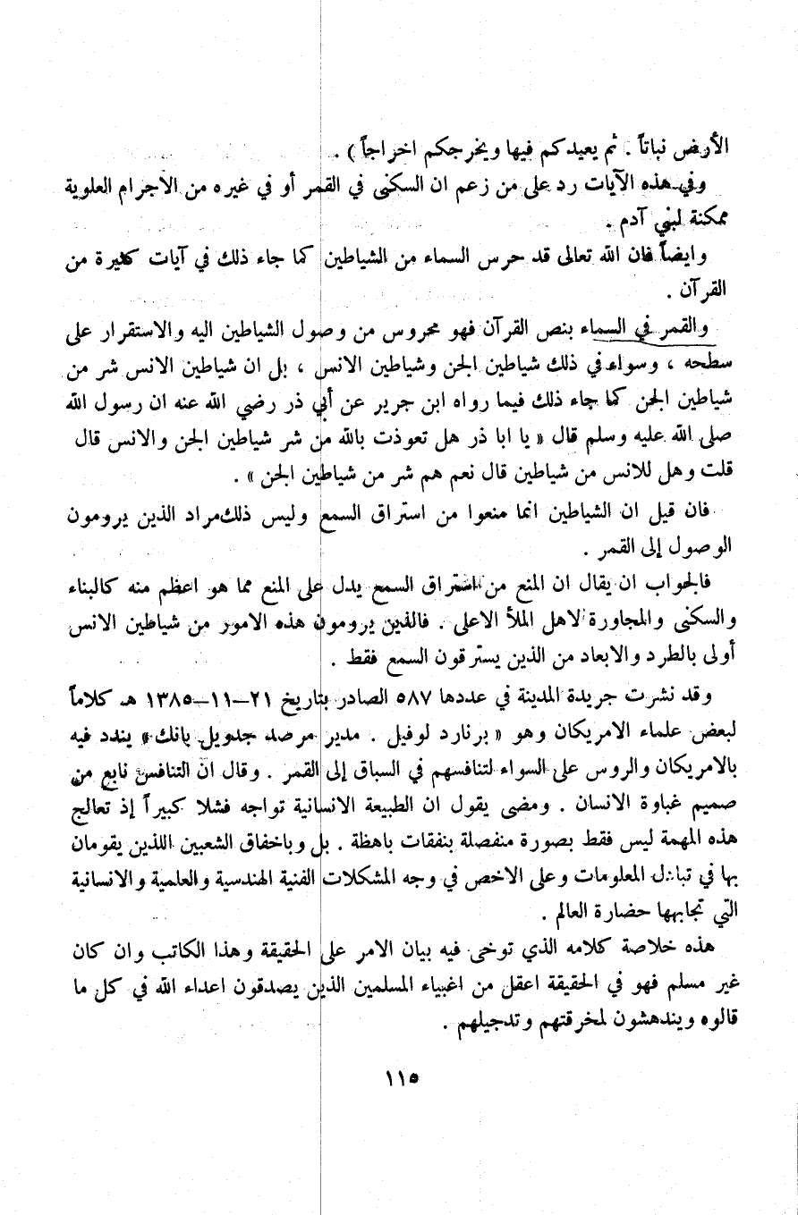 والقمر في السماء بنص القرآن فهو محروس من وصول الشياطين إليه والاستقرار على سطحه, وسواء في ذلك شياطين الجن وشياطين الإنس. بل إن شياطين الإنس شر من شياطين الجن كما جاء ذلك فيما رواه ابن جرير عن أبي ذر رضي الله عنه أن رسول الله صلى الله عليه وسلم قال «يا أبا ذر هل تعوذت بالله من شر شياطين الجن والإنس قال قلت وهل للإنس من شياطين قال نعم هم شر من شياطين الجن».
