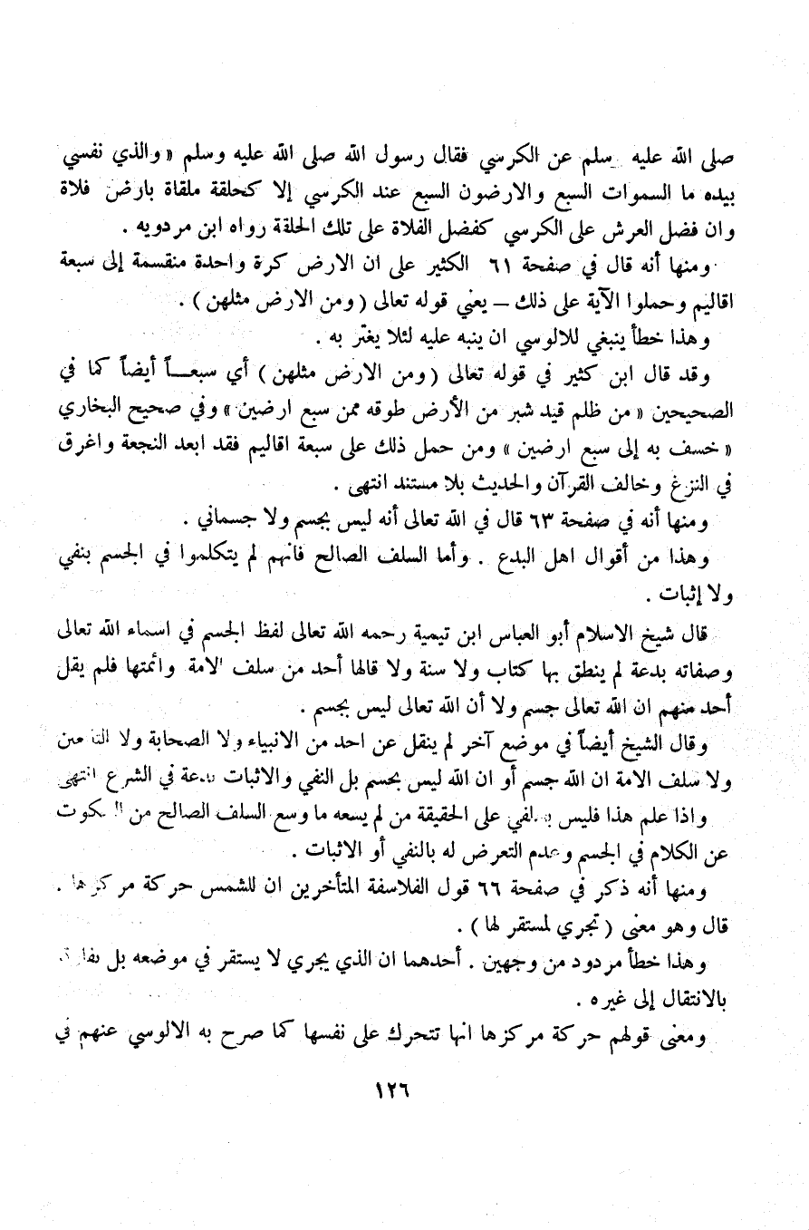 وقال الشيخ أيضاً في موضع آخر لم ينقل عن أحد من الأنبياء ولا الصحابة ولا التابعين ولا سلف الأمة أن الله جسم أو أن الله ليس بجسم بل النفي والإثبات بدعة في الشرع انتهى وإذا علم هذا فليس بسلفي على الحقيقة من لم يسعه ما وسع السلف الصالح من السكوت عن الكلام في الجسم وعدم التعرض له بالنفي أو الإثبات.