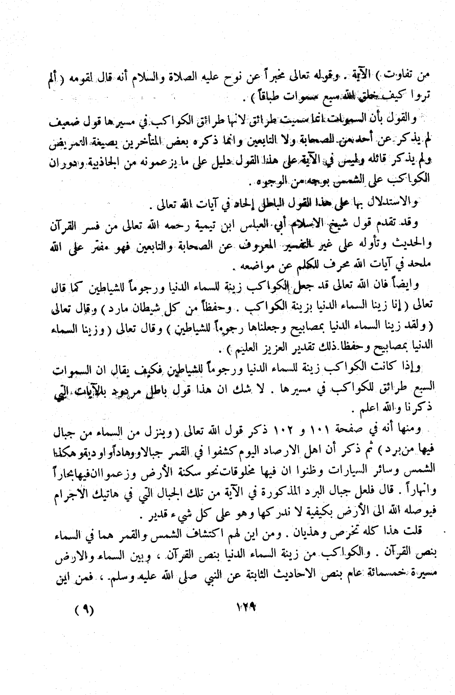 قلت هذا كله تخرص وهذيان. ومن أين لهم اكتشاف الشمس والقمر هما في السماء بنص القرآن. والكواكب من زينة السماء الدنيا بنص القرآن, وبين السماء والأرض مسيرة خمسمائة عام بنص الأحاديث الثابتة عن النبي صلى الله عليه وسلم, فمن أين