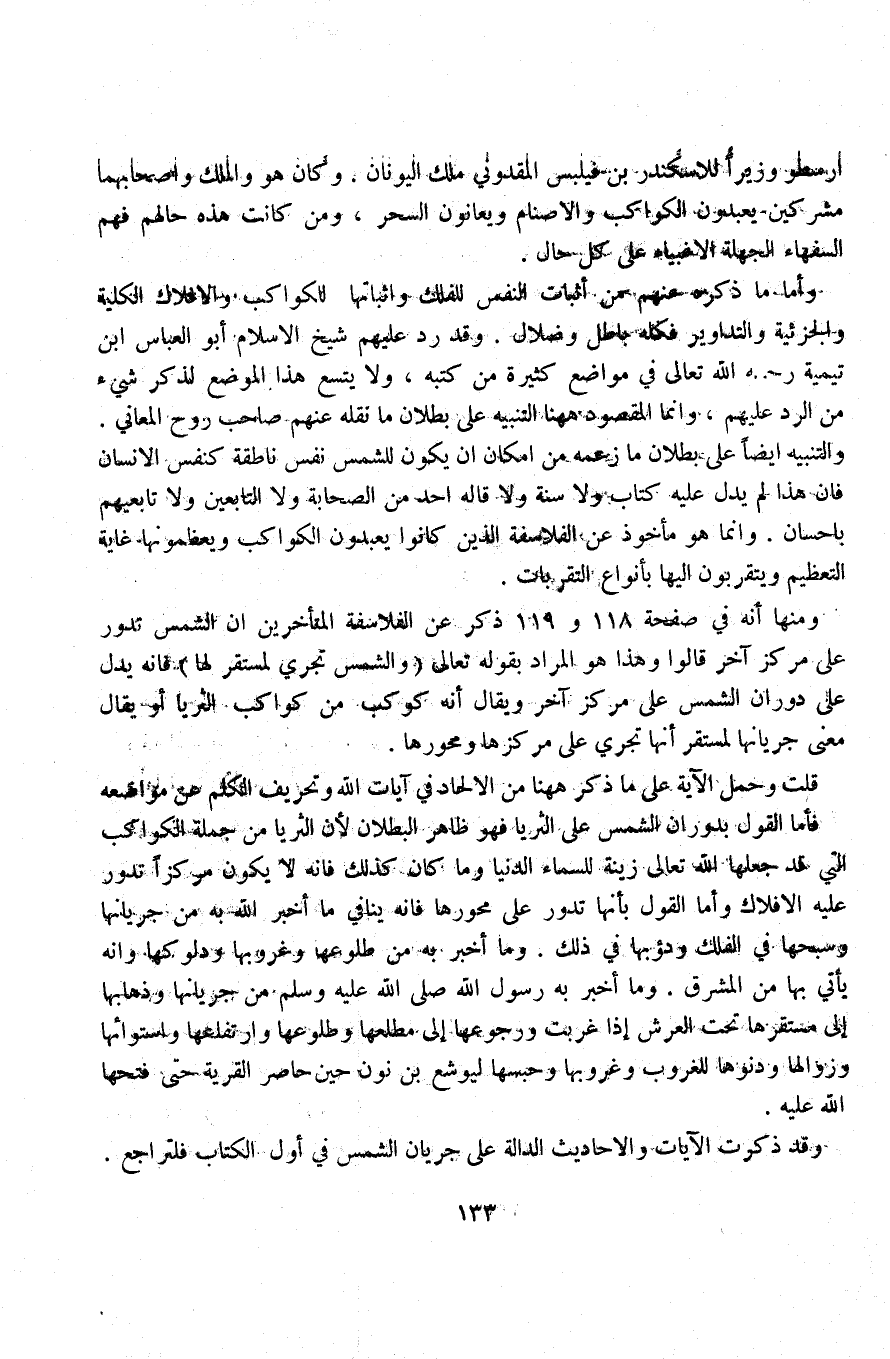 ومنها أنه في صفحة 118 و 119 ذكر عن الفلاسفة المتأخرين أن الشمس تدور على مركز آخر قالوا وهذا هو المراد بقوله تعالى (والشمس تجري لمستقر لها) فإنه يدل على دوران الشمس على مركز آخر ويقال إنه كوكب من كواكب الثريا أو يقال معنى جريانها لمستقر أنها تجري على مركزها ومحورها.