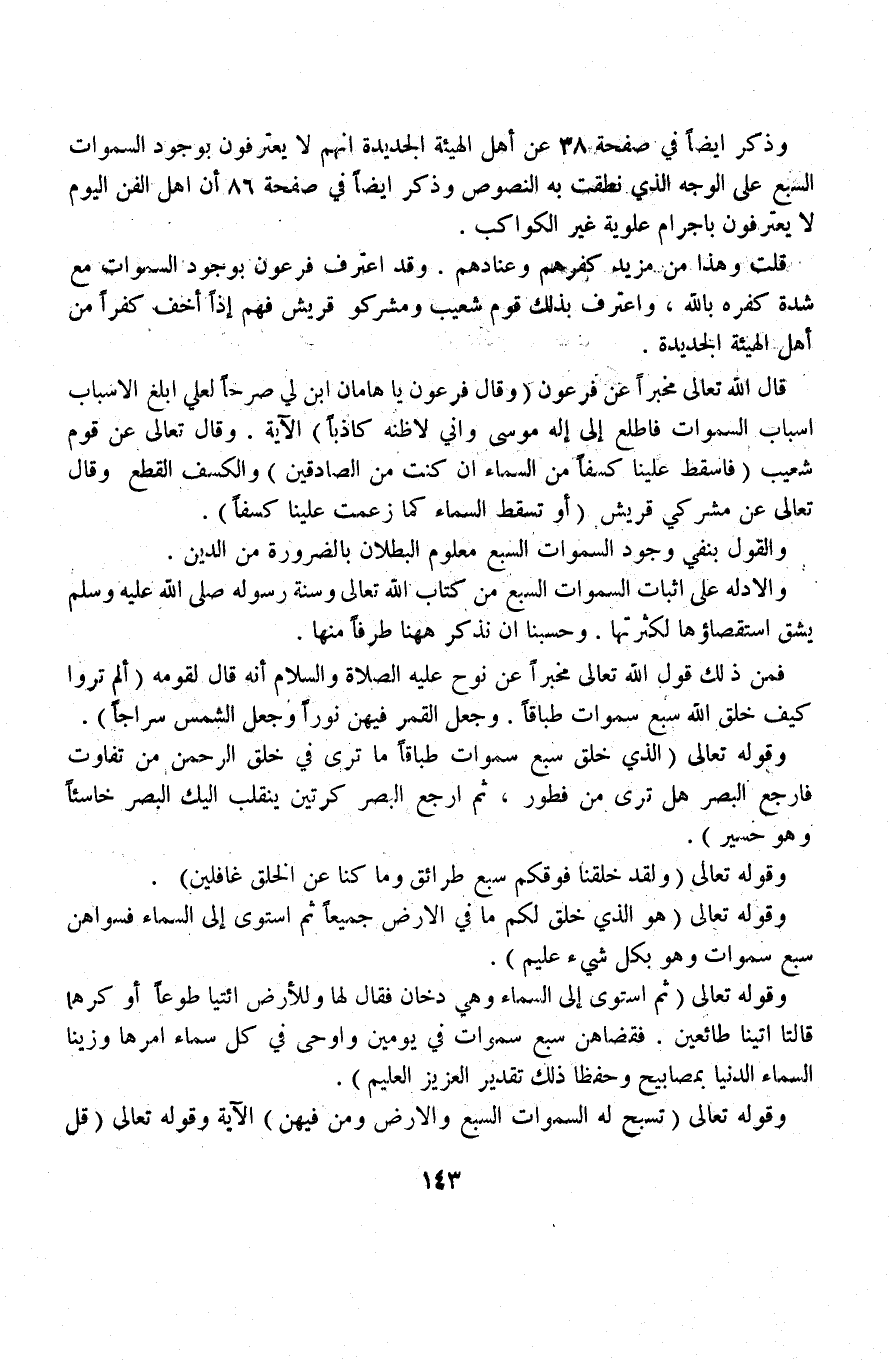 وذكر أيضاً في صفحة 38 عن أهل الهيئة الجديدة أنهم لا يعترفون بوجود السموات السبع على الوجه الذي نطقت به النصوص وذكر أيضاً في صفحة 86 أن أهل الفن اليوم لا يعترفون بأجرام علوية غير الكواكب.