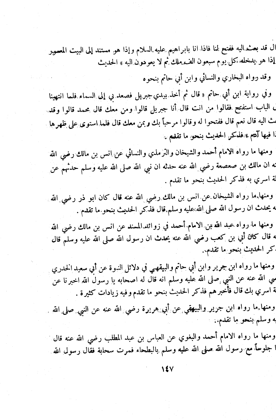 ومنها ما رواه الإمام أحمد والشيخان والترمذي والنسائي عن أنس بن مالك رضي الله عنه أن مالك بن صعصعة رضي الله عنه حدثه أن نبي الله صلى الله عليه وسلم حدثهم عن ليلة أسري به فذكر الحديث بنحو ما تقدم.