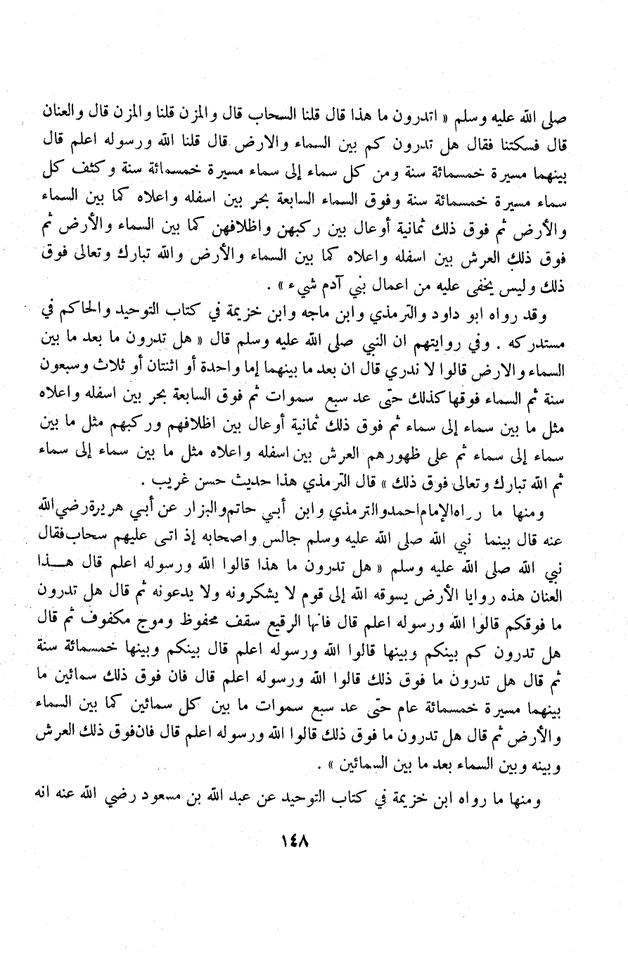 وقد رواه أبو داود والترمذي وابن ماجه وابن خزيمة في كتاب التوحيد والحاكم في مستدركه. وفي روايتهم أن النبي صلى الله عليه وسلم قال «هل تدرون ما بعد بين السماء والأرض قالوا لا ندري قال إن بعد ما بينهما إما واحدة أو اثنتان أو ثلاث وسبعون سنة ثم السماء فوقها كذلك حتى عد سبع سموات ثم فوق السابعة بحر بين أسفله وأعلاه مثل ما بين سماء إلى سماء ثم فوق ذلك ثمانية أوعال بين أظلافهم وركبهم مثل ما بين سماء إلى سماء ثم على ظهورهم العرش بين أسفله وأعلاه مثل ما بين سماء إلى سماء ثم الله تبارك وتعال فوق ذلك» قال الترمذي هذا حديث حسن غريب.