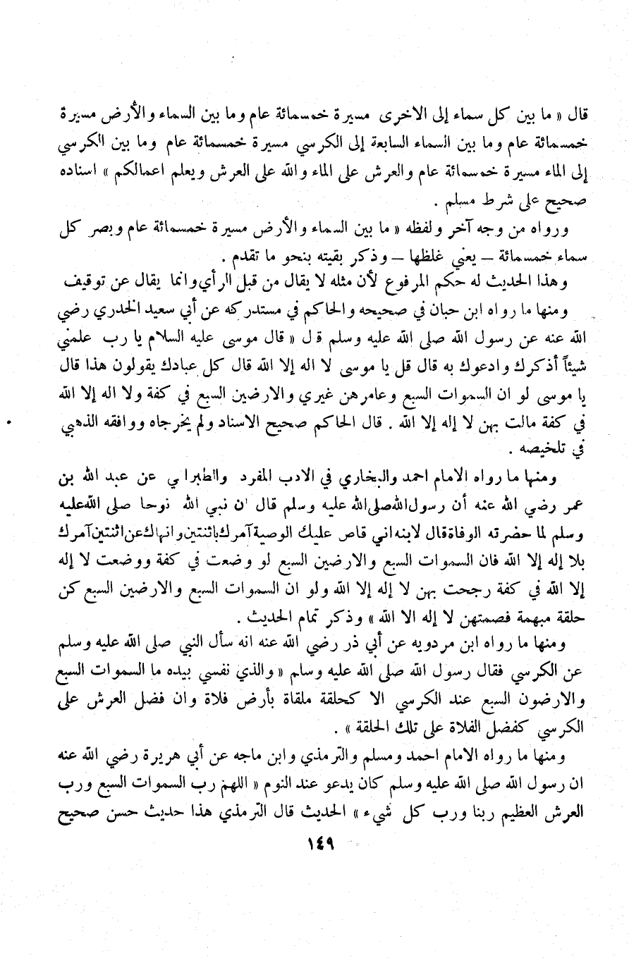 قال «ما بين كل سماء إلى الأخرى مسيرة خمسمائة عام وبين السماء والأرض مسيرة خمسمائة عام وما بين السماء السابعة إلى الكرسي مسيرة خمسمائة عام وما بين الكرسي إلى الماء مسيرة خمسمائة عام والعرش على الماء والله على العرش ويعلم أعمالكم» إسناده صحيح على شرط مسلم.