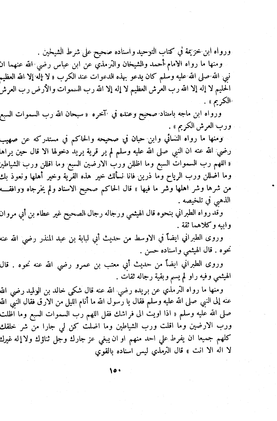 ومنها ما رواه الإمام أحمد والشيخان والترمذي عن ابن عباس رضي الله عنهما أن نبي الله صلى الله عليه وسلم كان يدعو بهذه الدعوات عند الكرب «لا إله إلا الله العظيم الحليم لا إله إلا الله رب العرش العظيم لا إله إلا الله رب السموات والأرض رب العرش الكريم».