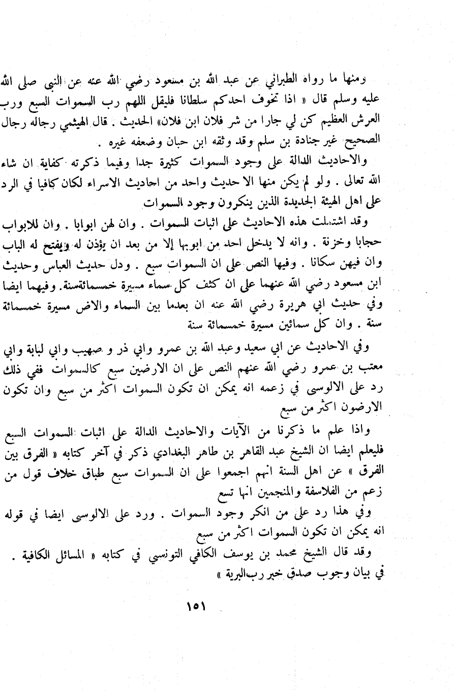 وإذا علم ما ذكرنا من الآيات والأحاديث الدالة على إثبات السموات السبع فليعلم أيضا أن الشيخ عبد القاهر بن طاهر البغدادي ذكر في آخر كتابه «الفرق بين الفرق» عن أهل السنة أنهم أجمعوا على أن السموات سبع طباق خلاف قول من زعم من الفلاسفة والمنجمين أنها تسع.