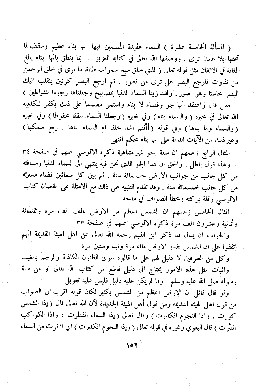 (المسألة الخامسة عشر) السماء عقيدة المسلمين فيها أنها بناء عظيم وسقف لما تحتها بلا عمد ترى. ووصفها الله تعالى في كتابه العزيز. بما ينطق بأنها بناء بالغ الغاية في الإتقان مثل قوله تعالى (الذي خلق سبع سموات طباقا ما ترى في خلق الرحمن من تفاوت فارجع البصر هل ترى من فطور. ثم ارجع البصر كرتين ينقلب إليك البصر خاسئا وهو حسير. ولقد زينا السماء الدنيا بمصابيح وجعلناها رجوما للشياطين).