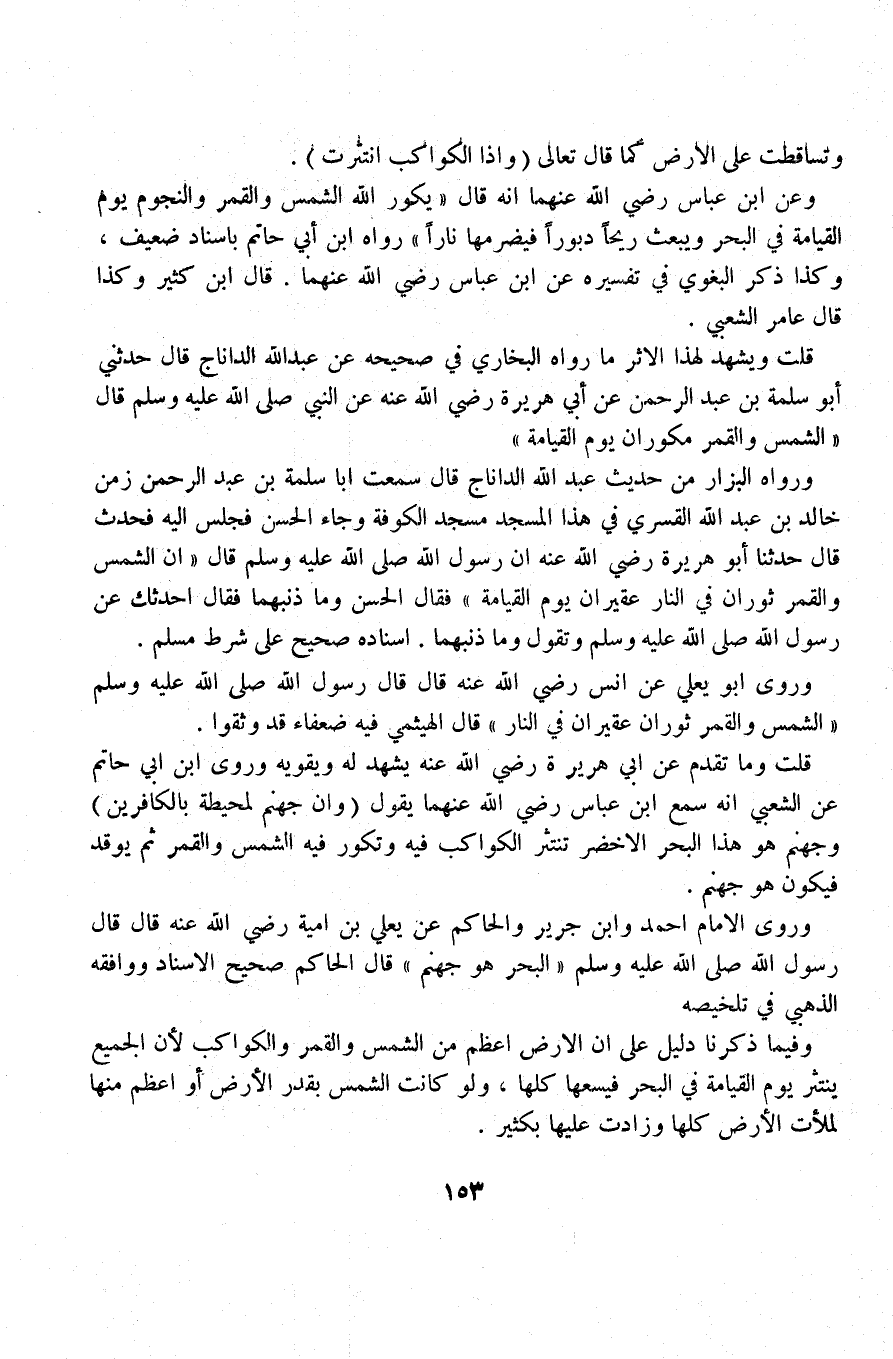 وعن ابن عباس رضي الله عنهما أنه قال «يكور الله الشمس والقمر والنجوم يوم القيامة في البحر ويبعث ريحاً دبوراً فيضرمها ناراً» رواه ابن أبي حاتم بإسناد ضعيف, وكذا ذكر البغوي في تفسيره عن ابن عباس رضي الله عنهما. قال ابن كثير وكذا قال عامر الشعبي.