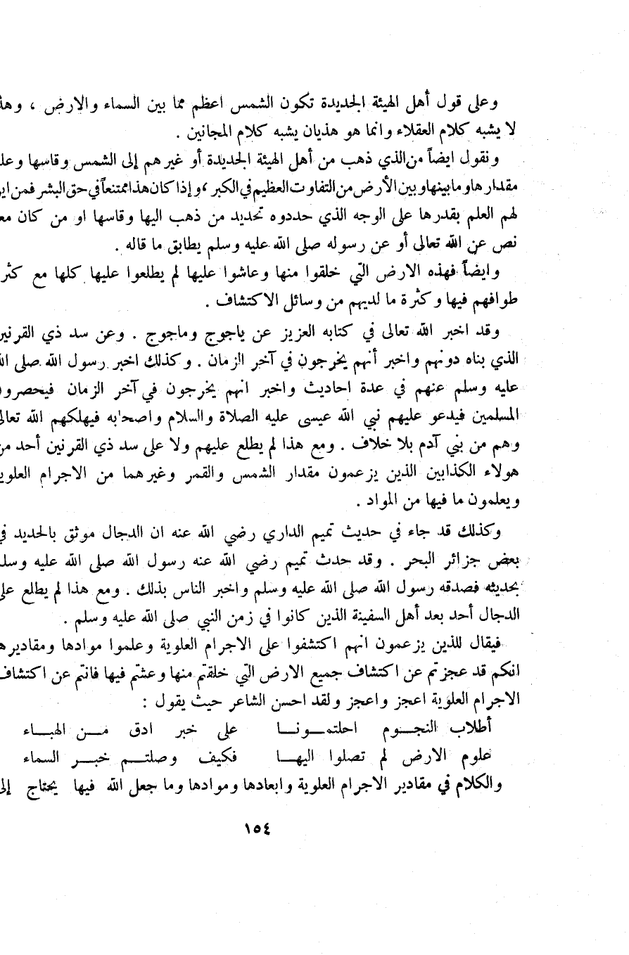 ونقول أيضاً من الذي ذهب من أهل الهيئة الجديدة أو غيرهم إلى الشمس وقاسها وعلم مقدارها وما بينها وبين الأرض من التفاوت العظيم في الكبر, وإذا كان هذا ممتنعاً في حق البشر فمن أين لهم العلم بقدرها على الوجه الذي حددوه تحديد من ذهب إليها وقاسها أو من كان معه نص عن الله تعالى أو عن رسوله صلى الله عليه وسلم يطابق ما قاله.