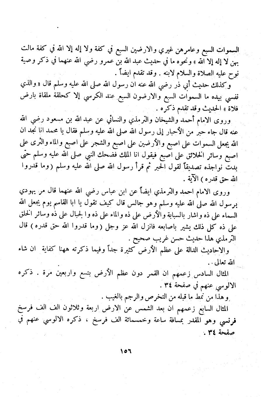 المثال السادس زعمهم أن القمر دون عظم الأرض بتسع وأربعين مرة. ذكره الألوسي عنهم في صفحة 34.