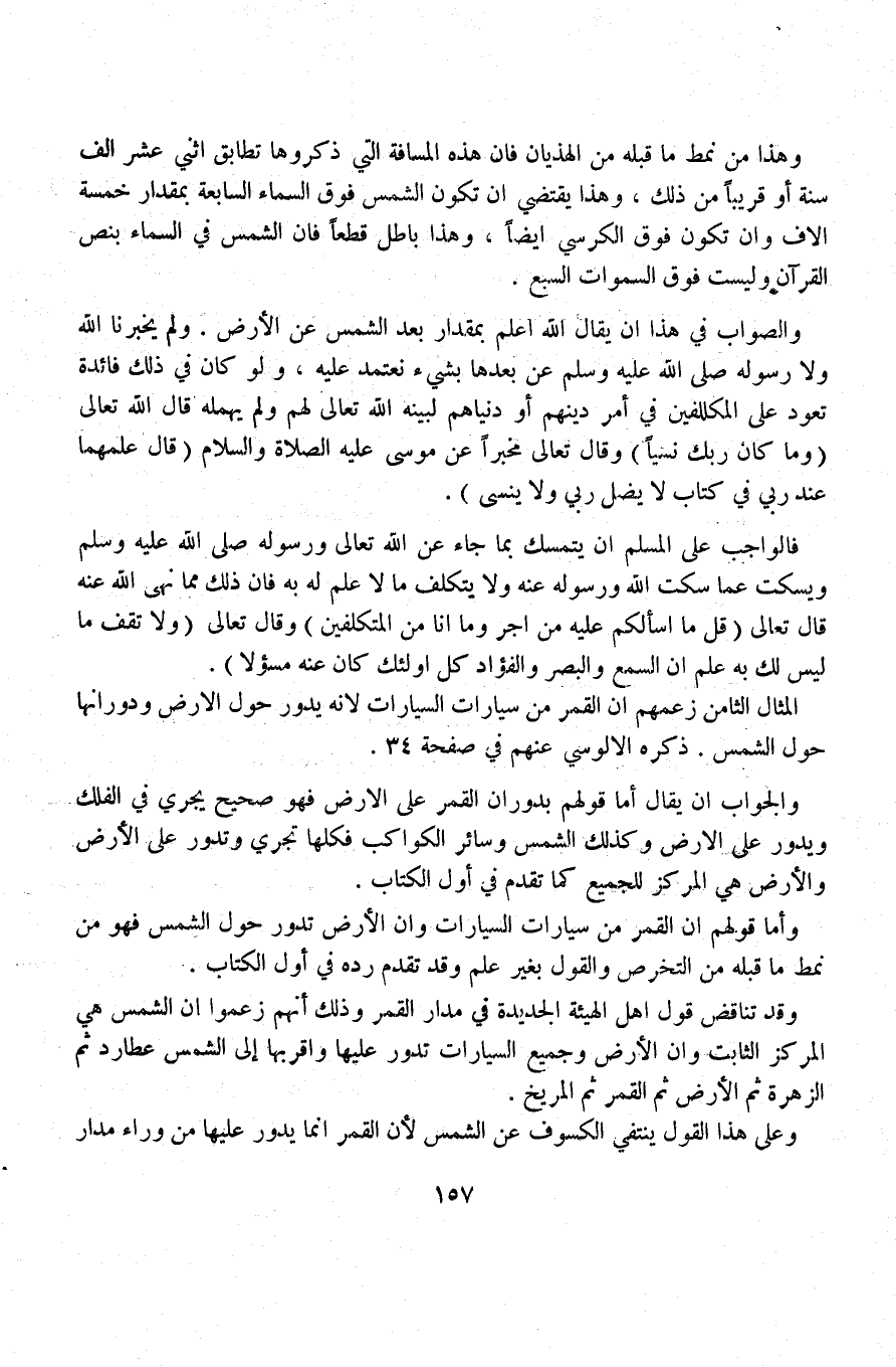 والجواب أن يقال أما قولهم بدوران القمر على الأرض فهو صحيح يجري في الفلك ويدور على الأرض وكذلك الشمس وسائر الكواكب فكلها تجري وتدور على الأرض هي المركز للجميع كما تقدم في أول الكتاب.