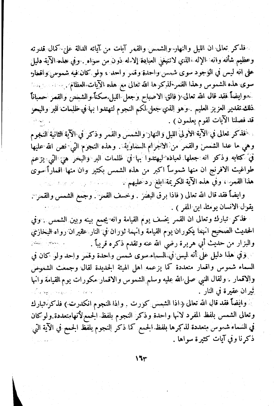 وأيضاً فقد قال الله تعالى (إذا الشمس كورت. وإذا النجوم انكدرت) فذكر تبارك وتعالى الشمس بلفظ المفرد لأنها واحدة وذكر النجوم بلفظ الجمع لأنها متعددة ولو كان في السماء شموس متعددة لذكرها بلفظ الجمع كما ذكر النجوم بلفظ الجمع في الآية التي ذكرنا وفي آيات كثيرة سواها.