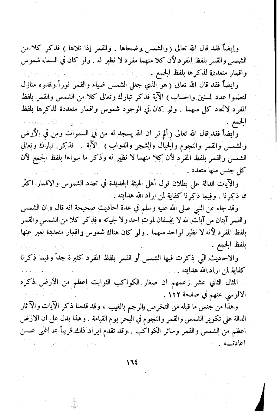 وأيضاً فقد قال الله تعالى (هو الذي جعل الشمس ضياء والقمر نوراً وقدره منازل لتعلموا عدد السنين والحساب) الآية فذكر تبارك وتعالى كلا من الشمس والقمر بلفظ المفرد لاتحاد كل منهما. ولو كان في الوجود شموس وأقمار متعددة لذكرها بلفظ الجمع.