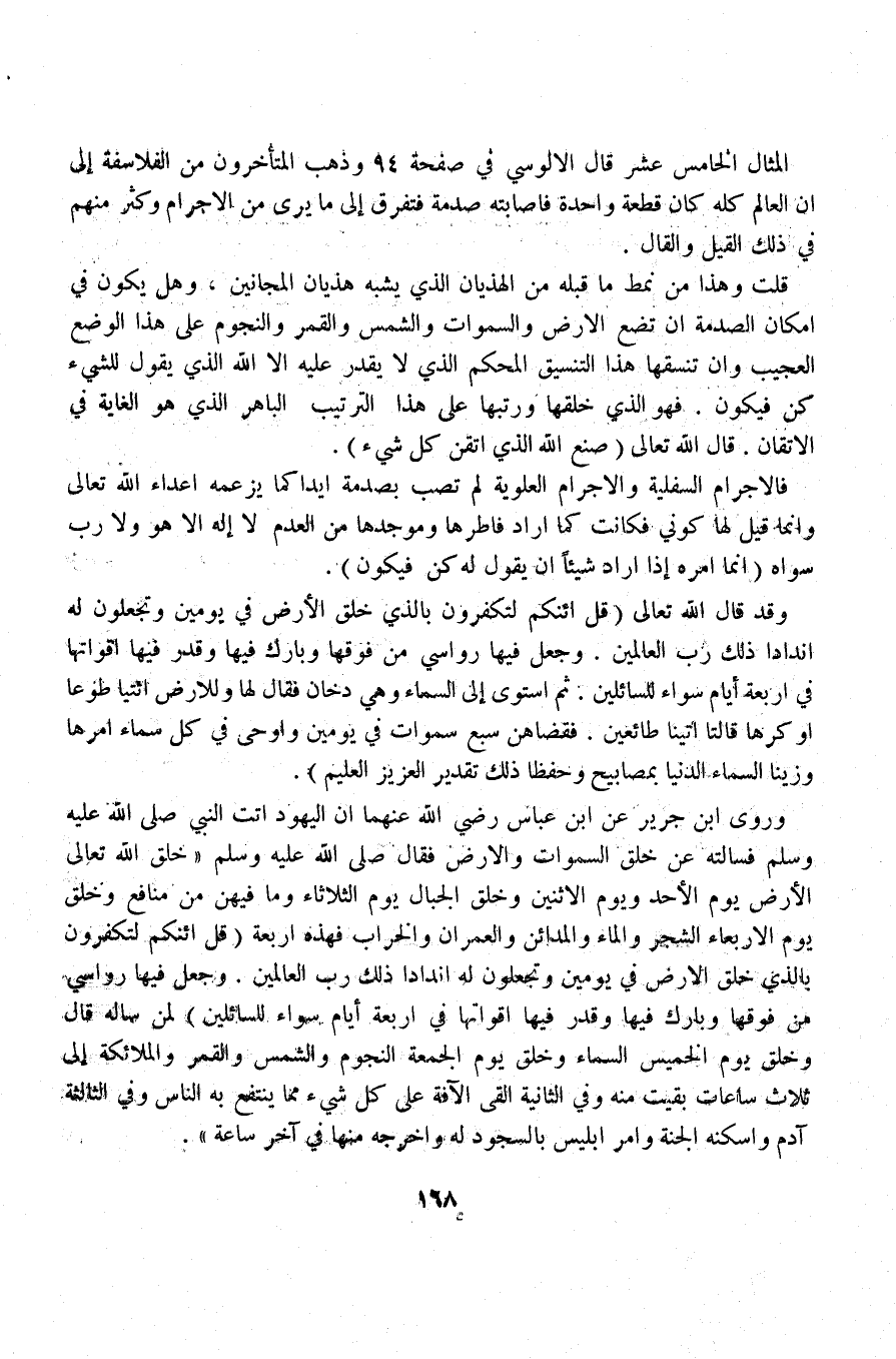 المثال الخامس عشر قال الألوسي في صفحة 94 وذهب المتأخرون من الفلاسفة إلى أن العالم كله كان قطعة واحدة فأصابته صدمة فتفرق إلى ما يرى من الأجرام وكثر منهم في ذلك القيل والقال.