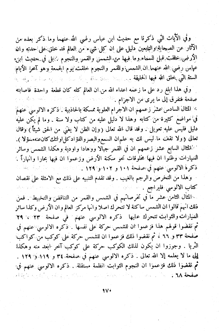 المثال السابع عشر زعمهم أن في القمر جبالا ووهادا وأودية وهكذا الشمس وسائر السيارات وظنوا أن فيها مخلوقات نحو سكنة الأرض وزعموا أن فيها بحاراً وأنهاراً.