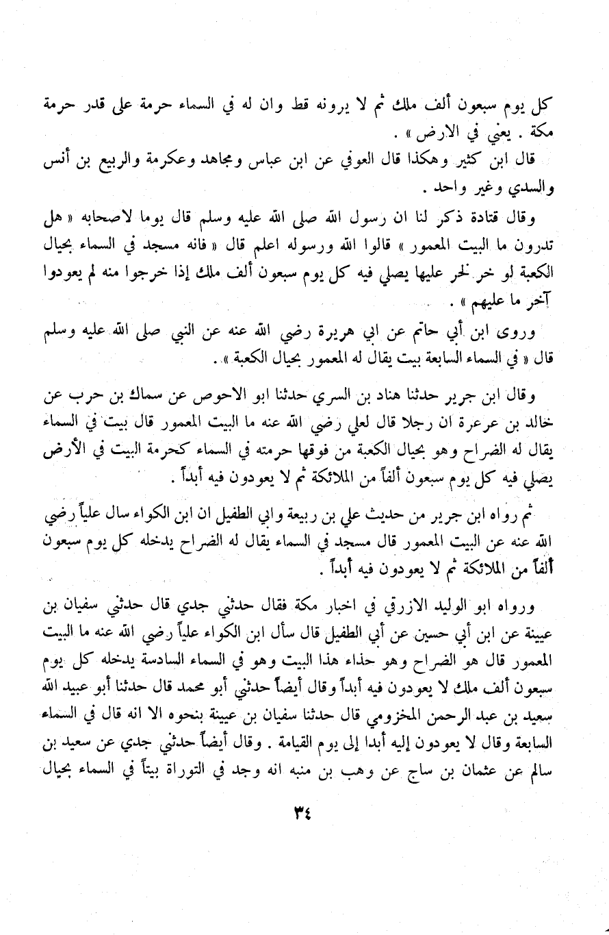 ورواه أبو الوليد الأزرقي في أخبار مكة فقال حدثني جدي قال حدثني سفيان بن عيينة عن ابن أبي حسين عن أبي الطفيل قال سأل ابن الكواء علياً رضي الله عنه ما البيت المعمور قال هو الضراح وهو حذاء هذا البيت وهو في السماء السادسة يدخله كل يوم سبعون ألف ملك لا يعودون فيه أبداً وقال أيضاً حدثني أبو محمد قال حدثنا أبو عبيد الله سعيد بن عبد الرحمن المخزومي قال حدثنا سفيان بن عيينة بنحوه إلا أنه قال في السماء السابعة وقال لا يعودون إليه أبداً إلى يوم القيامة. وقال أيضاً حدثني جدي عن سعيد بن سالم عن عثمان بن ساج عن وهب بن منبه أنه وجد في التوراة بيتاً في السماء بحيال