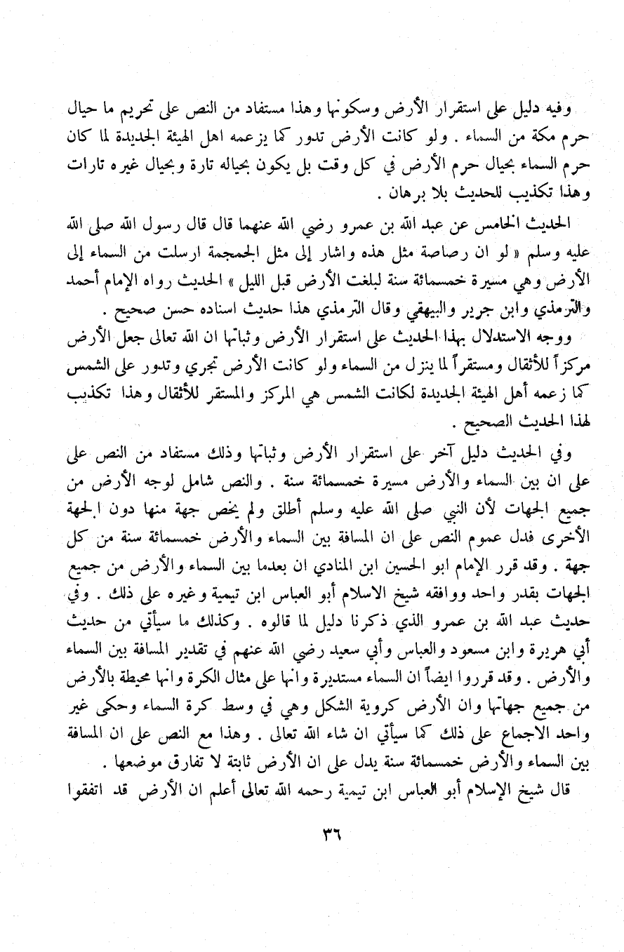 وفي الحديث دليل آخر على استقرار الأرض وثباتها وذلك مستفاد من النص على أن بين السماء والأرض مسيرة خمسمائة سنة. والنص شامل لوجه الأرض من جميع الجهات لأن النبي صلى الله عليه وسلم أطلق ولم يخص جهة منها دون الجهة الأخرى فدل عموم النص على أن المسافة بين السماء والأرض خمسمائة سنة من كل جهة. وقد قرر الإمام أبو الحسين ابن المنادي أن بعد ما بين السماء والأرض من جميع الجهات بقدر واحد ووافقه شيخ الإسلام أبو العباس ابن تيمية وغيره على ذلك. وفي حديث عبد الله بن عمرو الذي ذكرنا دليل لما قالوه. وكذلك ما سيأتي من حديث أبي هريرة وابن مسعود والعباس وأبي سعيد رضي الله عنهم في تقدير المسافة بين السماء والأرض. وقد قرروا أيضاً أن السماء مستديرة وأنها على مثال الكرة وأنها محيطة بالأرض من جميع جهاتها وأن الأرض كروية الشكل وهي في وسط كرة السماء وحكى غير واحد الإجماع على ذلك كما سيأتي إن شاء الله تعالى. وهذا مع النص على أن المسافة بين السماء والأرض خمسمائة سنة يدل على أن الأرض ثابتة لا تفارق موضعها.