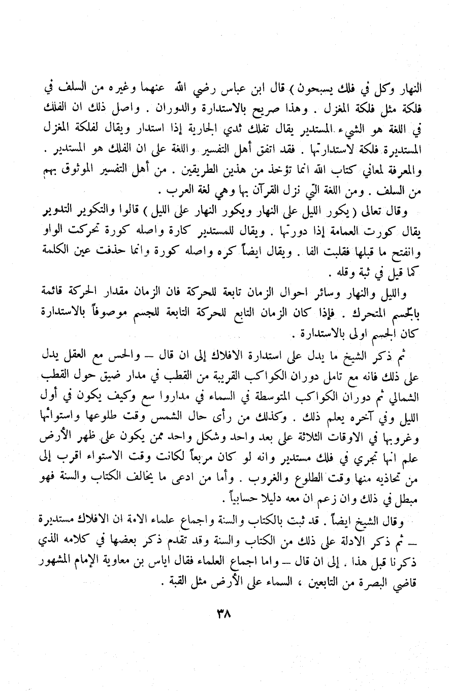 النهار وكل في فلك يسبحون) قال ابن عباس رضي الله عنهما وغيره من السلف في فلكة مثل فلكة المغزل. وهذا صريح بالاستدارة والدوران. وأصل ذلك أن الفلك في اللغة هو الشيء المستدير يقال تفلك ثدي الجارية إذا استدار ويقال لفلكة المغزل المستديرة فلكة لاستدارتها. فقد اتفق أهل التفسير واللغة على أن الفلك هو المستدير.