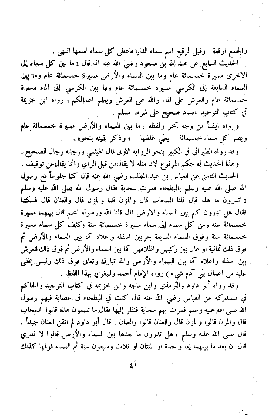الحديث الثامن عن العباس بن عبد المطلب رضي الله عنه قال كنا جلوساً مع رسول الله صلى الله عليه وسلم بالبطحاء فمرت سحابة فقال رسول الله صلى الله عليه وسلم «أتدرون ما هذا قال قلنا السحاب قال والمزن قلنا والمزن قال والعنان قال فسكتنا فقال هل تدرون كم بين السماء والأرض قال قلنا الله ورسوله أعلم قال بينهما مسيرة خمسمائة سنة ومن كل سماء إلى سماء مسيرة خمسمائة سنة وكثف كل سماء مسيرة خمسمائة سنة وفوق السماء السابعة بحر بين أسفله وأعلاه كما بين السماء والأرض ثم فوق ذلك ثمانية أوعال بين ركبهن وأظلافهن كما بين السماء والأرض ثم فوق ذلك العرش بين أسفله وأعلاه كما بين السماء والأرض والله تبارك وتعالى فوق ذلك وليس يخفى عليه من أعمال بني آدم شيء) رواه الإمام أحمد والبغوي بهذا اللفظ.