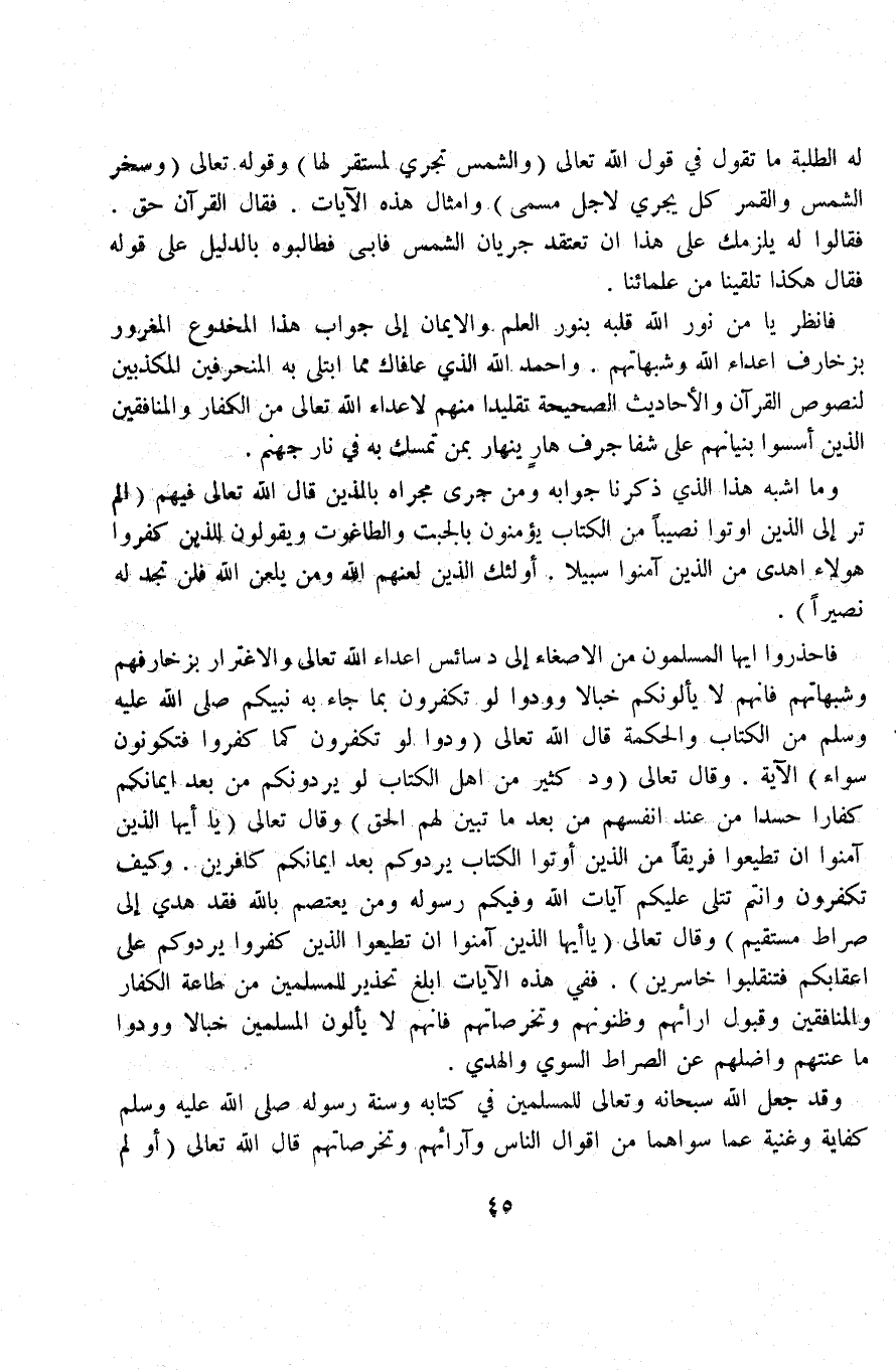 فاحذروا أيها المسلمون من الإصغاء إلى دسائس أعداء الله تعالى والاغترار بزخارفهم وشبهاتهم فإنهم لا يألونكم خبالا وودوا لو تكفرون بما جاء به نبيكم صلى الله عليه وسلم من الكتاب والحكمة قال الله تعالى (ودوا لو تكفرون كما كفروا فتكونون سواء) الآية. وقال تعالى (ود كثير من أهل الكتاب لو يردونكم من بعد إيمانكم كفارا حسدا من عند أنفسهم من بعد ما تبين لهم الحق) وقال تعالى (يا أيها الذين آمنوا إن تطيعوا فريقاً من الذين أوتوا الكتاب يردوكم بعد إيمانكم كافرين. وكيف تكفرون وأنتم تتلى عليكم آيات الله وفيكم رسوله ومن يعتصم بالله فقد هدي إلى صراط مستقيم) وقال تعالى (يا أيها الذين آمنوا إن تطيعوا الذين كفروا يردوكم على أعقابكم فتنقلبوا خاسرين). ففي هذه الآيات أبلغ تحذير للمسلمين من طاعة الكفار والمنافقين وقبول آرائهم وظنونهم وتخرصاتهم فإنهم لا يألون المسلمين خبالا وودوا ما عنتهم وأضلهم عن الصراط السوي والهدي.