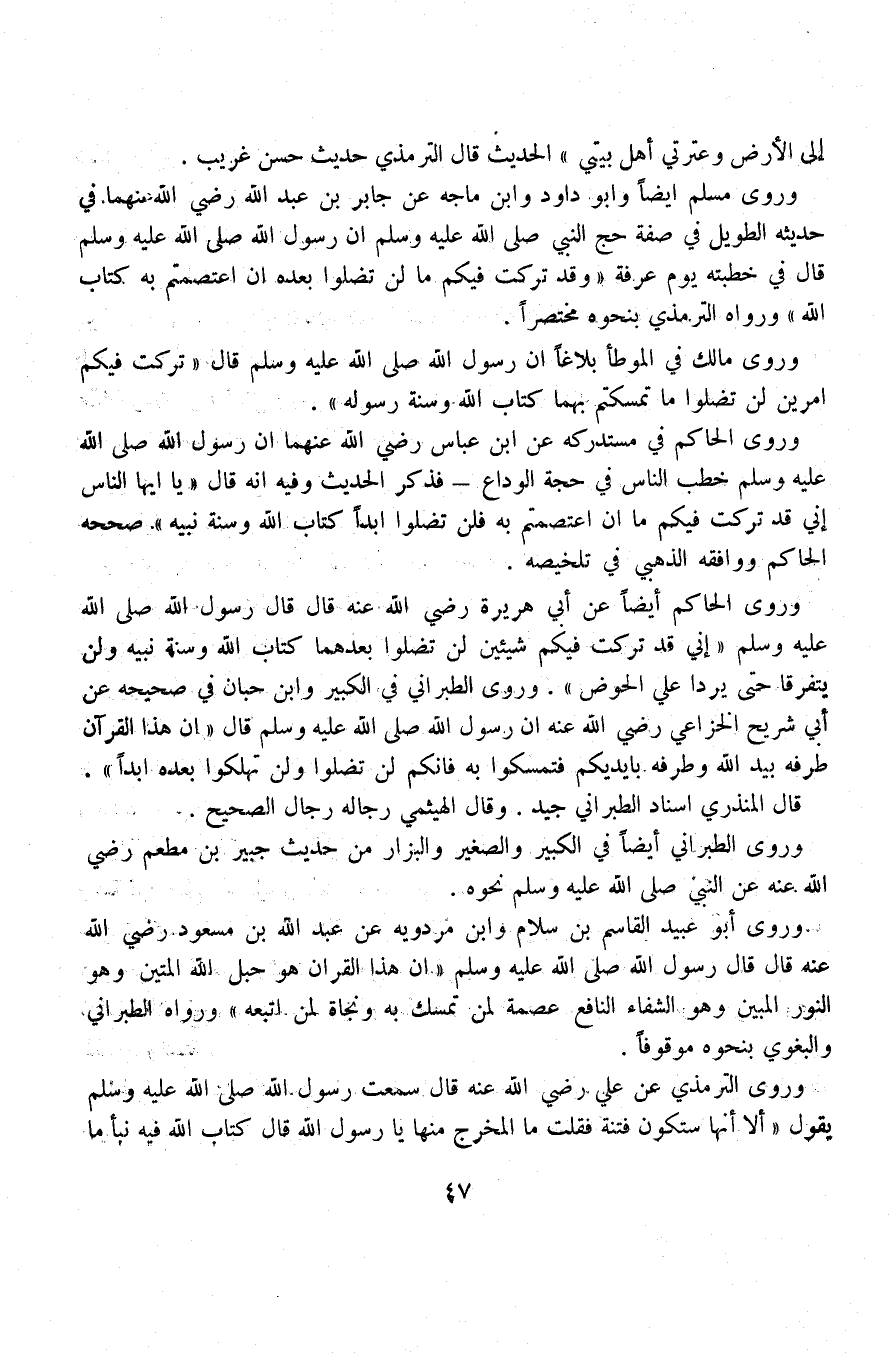 وروى الحاكم أيضاً عن أبي هريرة رضي الله عنه قال قال رسول الله صلى الله عليه وسلم «إني قد تركت فيكم شيئين لن تضلوا بعدهما كتاب الله وسنة نبيه ولن يتفرقا حتى يردا علي الحوض». وروى الطبراني في الكبير وابن حبان في صحيحه عن أبي شريح الخزاعي رضي الله عنه أن رسول الله صلى الله عليه وسلم قال «إن هذا القرآن طرفه بيد الله وطرفه بأيديكم فتمسكوا به فإنكم لن تضلوا ولن تهلكوا بعده أبداً».