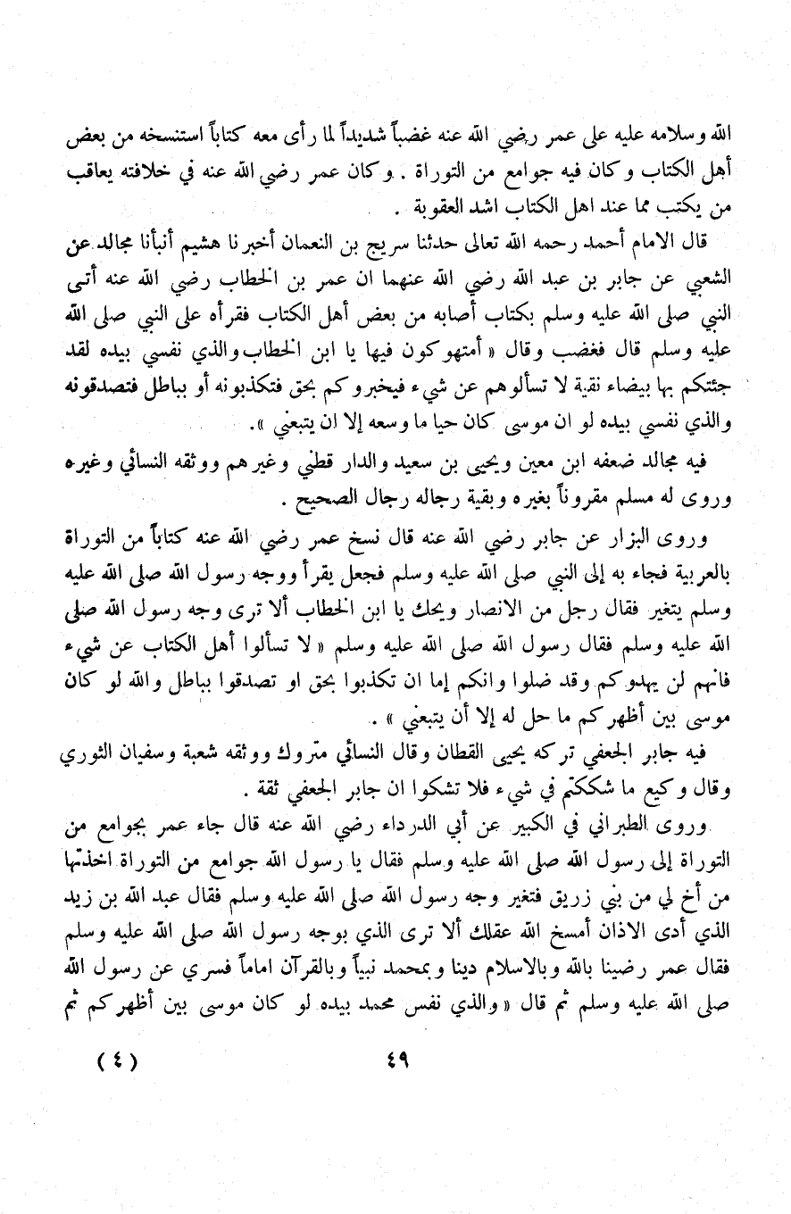 الله وسلامه عليه على عمر رضي الله عنه غضباً شديداً لما رأى معه كتاباً استنسخه من بعض أهل الكتاب وكان فيه جوامع من التوراة. وكان عمر رضي الله عنه في خلافته يعاقب من يكتب مما عند أهل الكتاب أشد العقوبة.