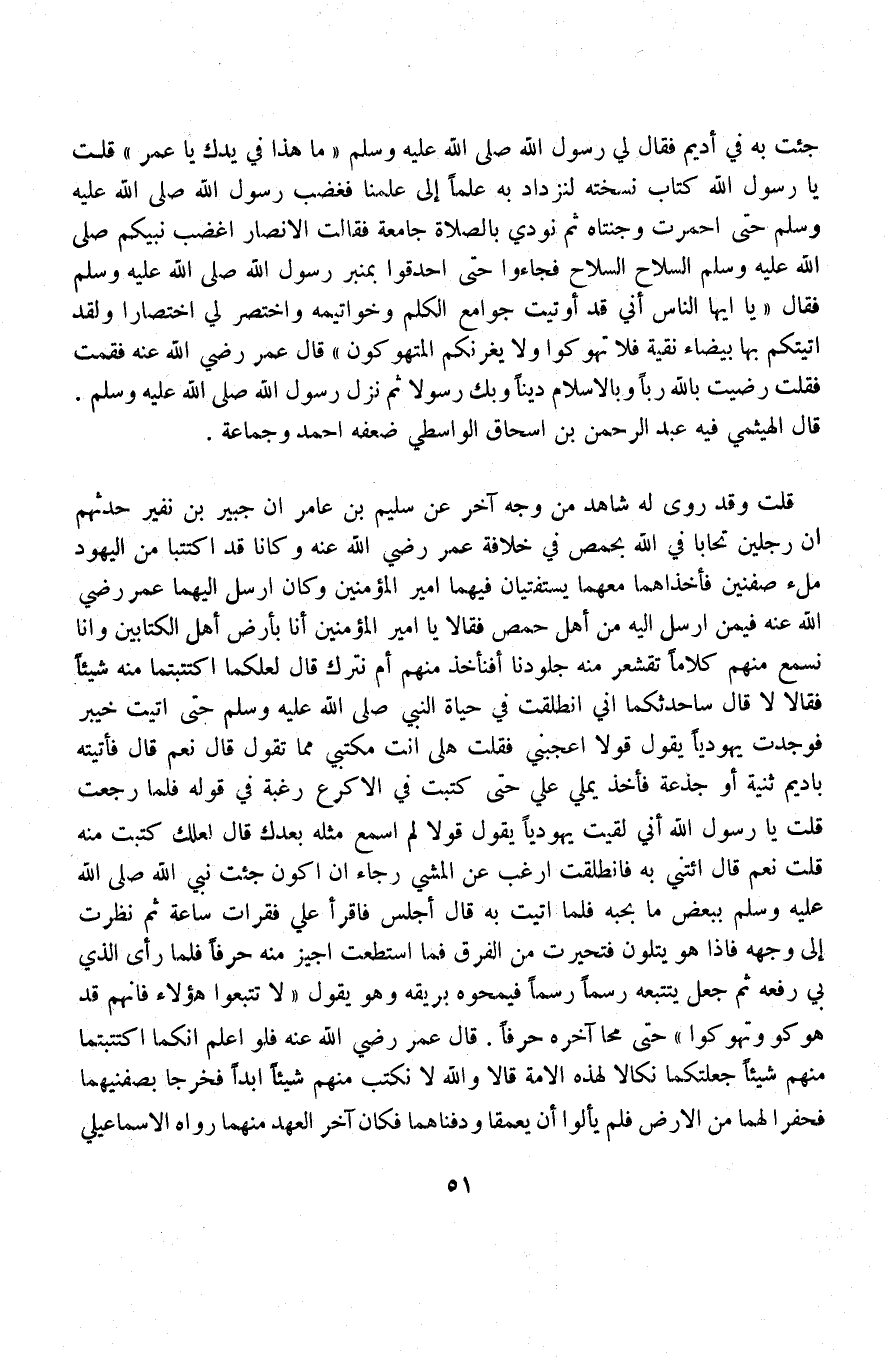 قلت وقد روى له شاهد من وجه آخر عن سليم بن عامر أن جبير بن نفير حدثهم أن رجلين تحابا في الله بحمص في خلافة عمر رضي الله عنه وكانا قد اكتتبا من اليهود ملء صفنين فأخذاهما معهما يستفتيان فيهما أمير المؤمنين وكان أرسل إليهما عمر رضي الله عنه فيمن أرسل إليه من أهل حمص فقالا يا أمير المؤمنين إنا بأرض أهل الكتابين وإنا نسمع منهم كلاماً تقشعر منه جلودنا أفنأخذه منهم أم نترك قال لعلكما اكتتبتما منه شيئاً فقالا لا قال سأحدثكما إني انطلقت في حياة النبي صلى الله عليه وسلم حتى أتيت خيبر فوجدت يهودياً يقول قولا أعجبني فقلت هل أنت مكتبي مما تقول قال نعم قال فأتيته بأديم ثنية أو جذعة فأخذ يملي علي حتى كتبت في الأكرع رغبة في قوله فلما رجعت قلت يا رسول الله إني لقيت يهودياً يقول قولا لم أسمع مثله بعدك قال لعلك كتبت منه قلت نعم قال ائتني به فانطلقت ارغب عن المشي رجاء أن أكون جئت نبي الله صلى الله عليه وسلم ببعض ما يحبه فلما أتيت به قال اجلس فاقرأ علي فقرأت ساعة ثم نظرت إلى وجهه فإذا هو يتلون فتحيرت من الفرق فما استطعت أجيز منه حرفاً فلما رأى الذي بي رفعه ثم جعل يتتبعه رسماً رسماً فيمحوه بريقه وهو يقول «لا تتبعوا هؤلاء فإنهم قد هوكو وتهوكوا» حتى محا آخره حرفاً. قال عمر رضي الله عنه فلو أعلم أنكما اكتتبتما منهم شيئاً جعلتكما نكالا لهذه الأمة قالا والله لا نكتب منهم شيئاً أبداً فخرجا بصفنيهما فحفرا لهما من الأرض فلم يألوا أن يعمقا ودفناهما فكان آخر العهد منهما رواه الإسماعيلي