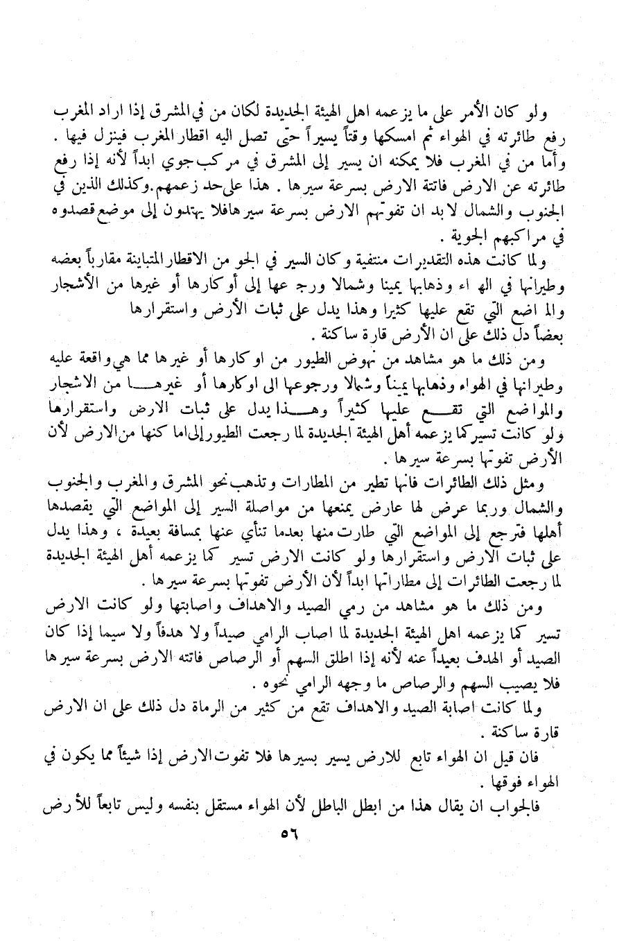 ولو كان الأمر على ما يزعمه أهل الهيئة الجديدة لكان من في المشرق إذا أراد المغرب رفع طائرته في الهواء ثم أمسكها وقتاً يسيراً حتى تصل إليه أقطار المغرب فينزل فيها.
