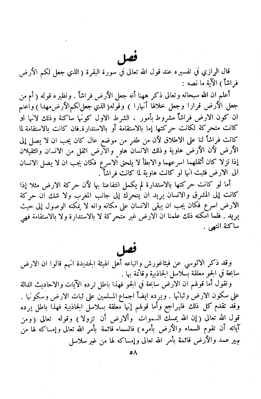 قال الرازي في تفسيره عند قول الله تعالى في سورة البقرة (الذي جعل لكم الأرض فراشاً) الآية ما نصه: