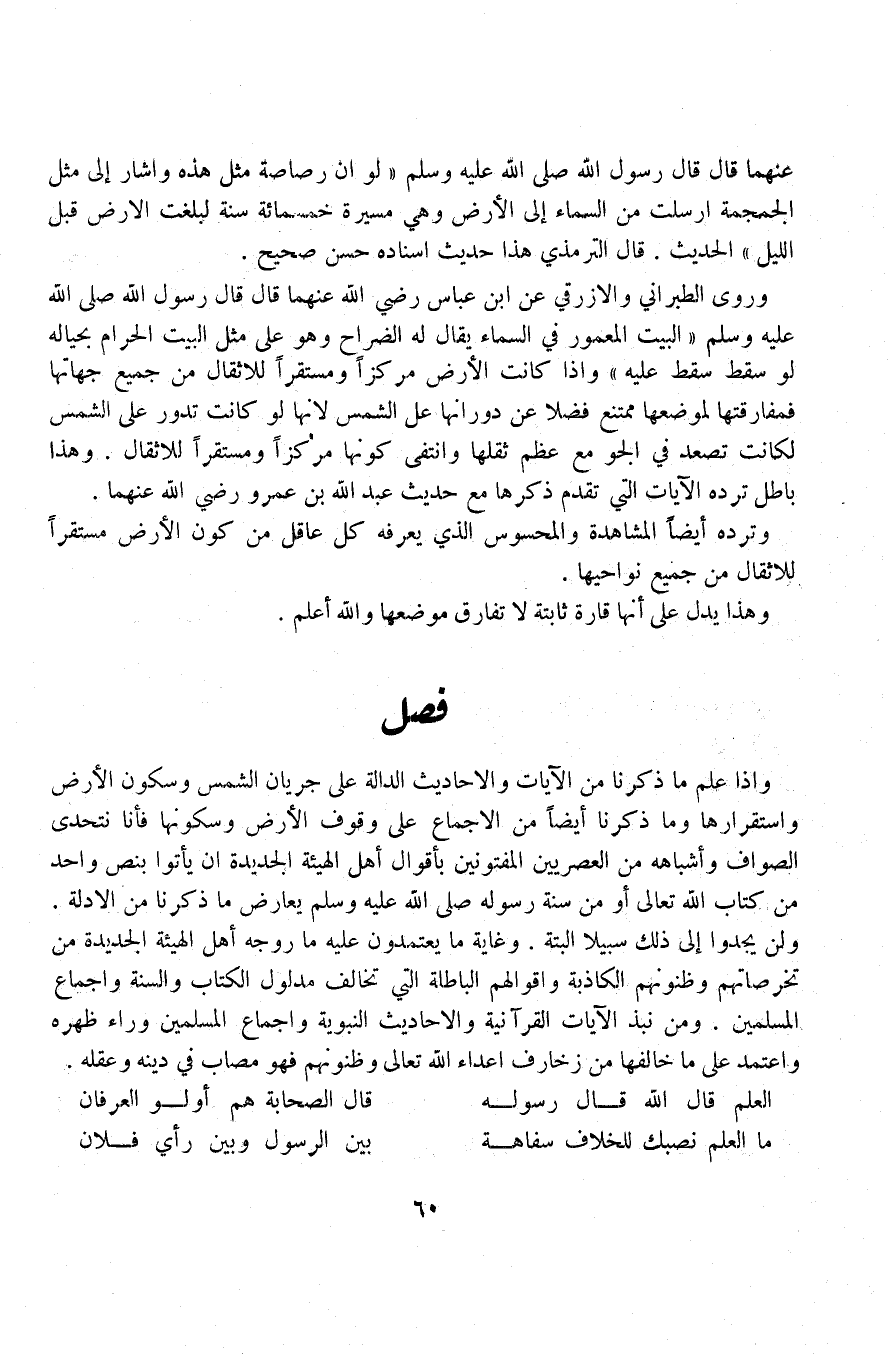 وروى الطبراني والأزرقي عن ابن عباس رضي الله عنهما قال قال رسول الله صلى الله عليه وسلم «البيت المعمور في السماء يقال له الضراح وهو على مثل البيت الحرام بحياله لو سقط سقط عليه» وإذا كانت الأرض مركزاً ومستقراً للأثقال من جميع جهاتها فمفارقتها لموضعها ممتنع فضلا عن دورانها على الشمس لأنها لو كانت تدور على الشمس لكانت تصعد في الجو مع عظم ثقلها وانتفى كونها مركزاً ومستقراً للأثقال. وهذا باطل ترده الآيات التي تقدم ذكرها مع حديث عبد الله بن عمرو رضي الله عنهما.