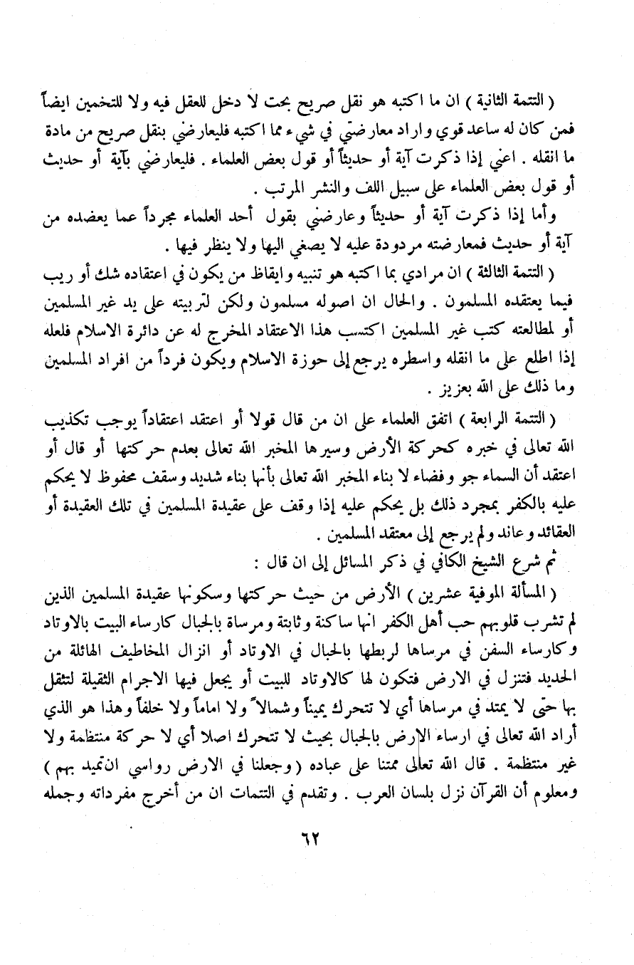 (المسألة الموفية عشرين) الأرض من حيث حركتها وسكونها عقيدة المسلمين الذين لم تشرب قلوبهم حب أهل الكفر أنها ساكنة وثابتة ومرساة بالجبال كإرساء البيت بالأوتاد وكإرساء السفن في مرساها لربطها بالحبال في الأوتاد أو إنزال المخاطيف الهائلة من الحديد فتنزل في الأرض فتكون لها كالأوتاد للبيت أو يجعل فيها الأجرام الثقيلة لتثقل بها حتى لا تميد في مرساها أي لا تتحرك يميناً ولا شمالاً ولا أماماً ولا خلفاً وهذا هو الذي أراد الله تعالى في إرساء الأرض بالجبال بحيث لا تتحرك أصلا أي لا حركة منتظمة ولا غير منتظمة. قال الله تعالى ممتنا على عباده (وجعلنا في الأرض رواسي أن تميد بهم) ومعلوم أن القرآن نزل بلسان العرب. وتقدم في التتمات أن من أخرج مفرداته وجمله