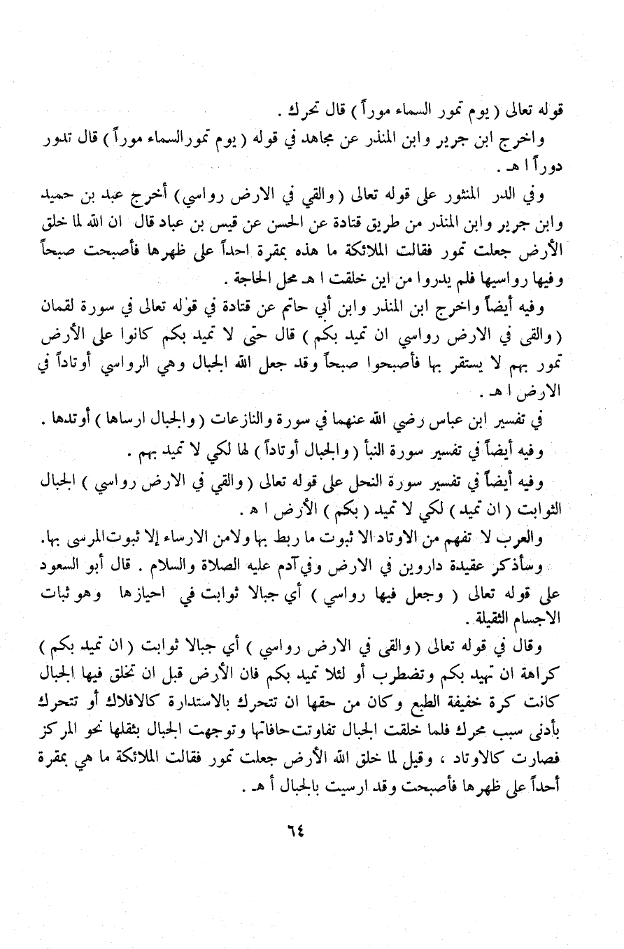 وفيه أيضاً وأخرج ابن المنذر وابن أبي حاتم عن قتادة في قوله تعالى في سورة لقمان (وألقى في الأرض رواسي أن تميد بكم) قال حتى لا تميد بكم كانوا على الأرض تمور بهم لا يستقر بها فأصبحوا صبحاً وقد جعل الله الجبال وهي الرواسي أوتاداً في الأرض أ. هـ.