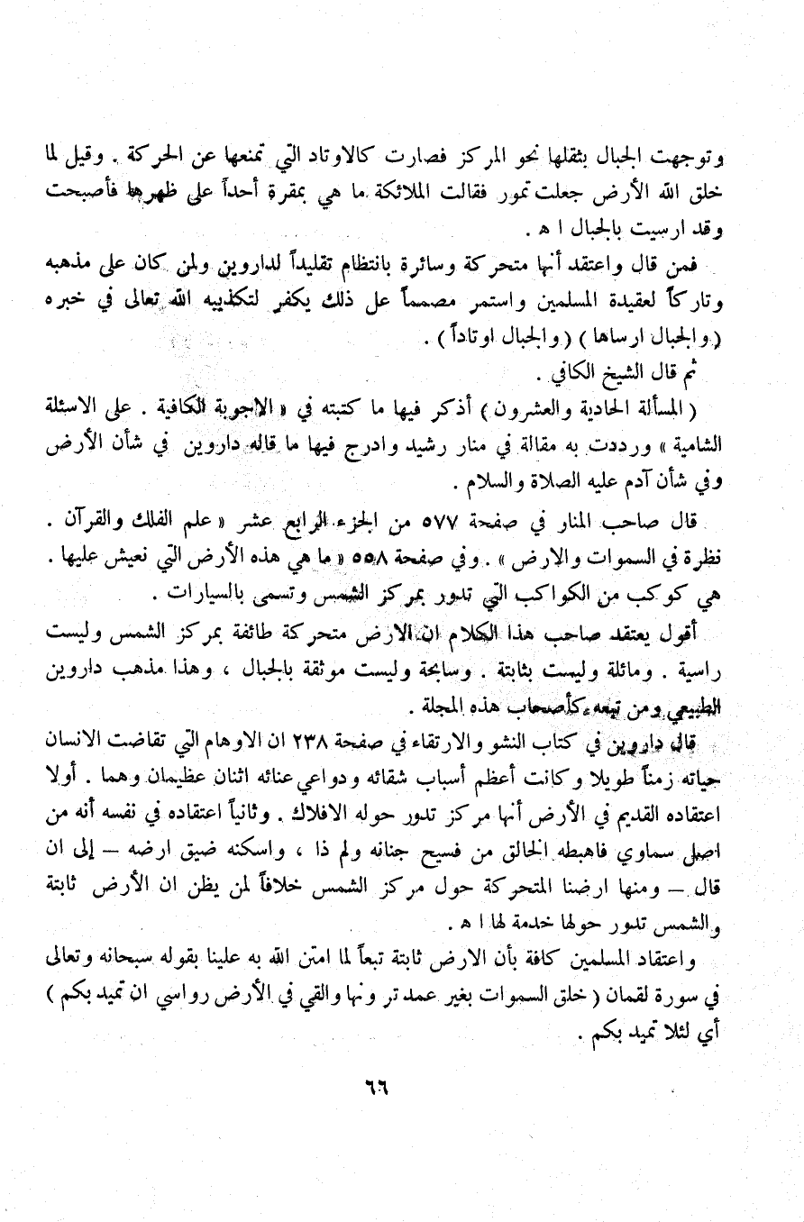 أقول يعتقد صاحب هذا الكلام أن الأرض متحركة طائفة بمركز الشمس وليست راسية. ومائدة وليست بثابتة. وسابحة وليست موثقة بالجبال. وهذا مذهب داروين الطبيعي ومن تبعه كأصحاب هذه المجلة.