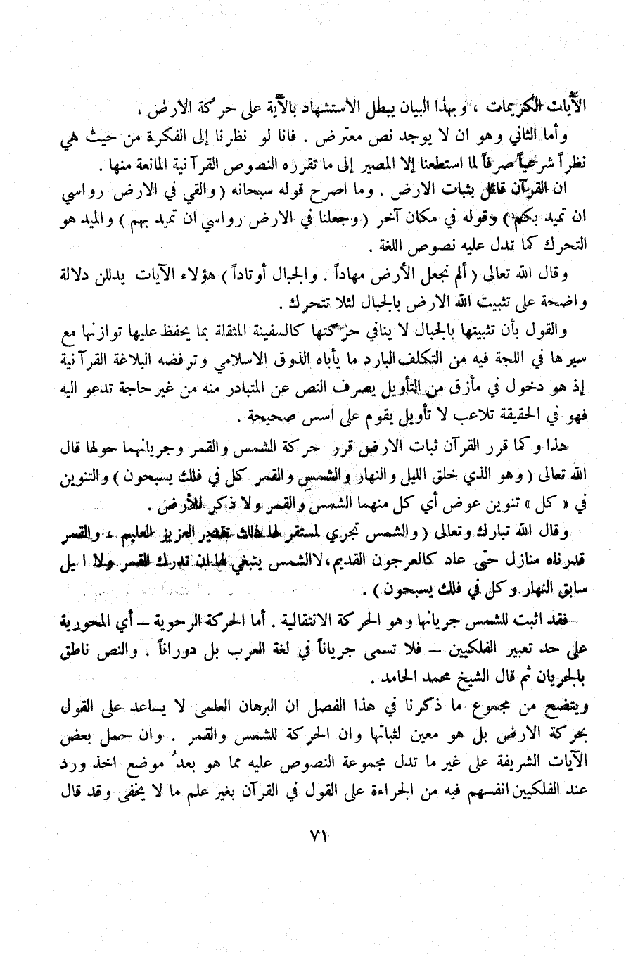 فقد أثبت للشمس جريانا وهو الحركة الانتقالية. أما الحركة الرحوية - أي المحورية على حد تعبير الفلكيين - فلا تسمى جرياناً في لغة العرب بل دوراناً. والنص ناطق بالجريان ثم قال الشيخ محمد الحامد.