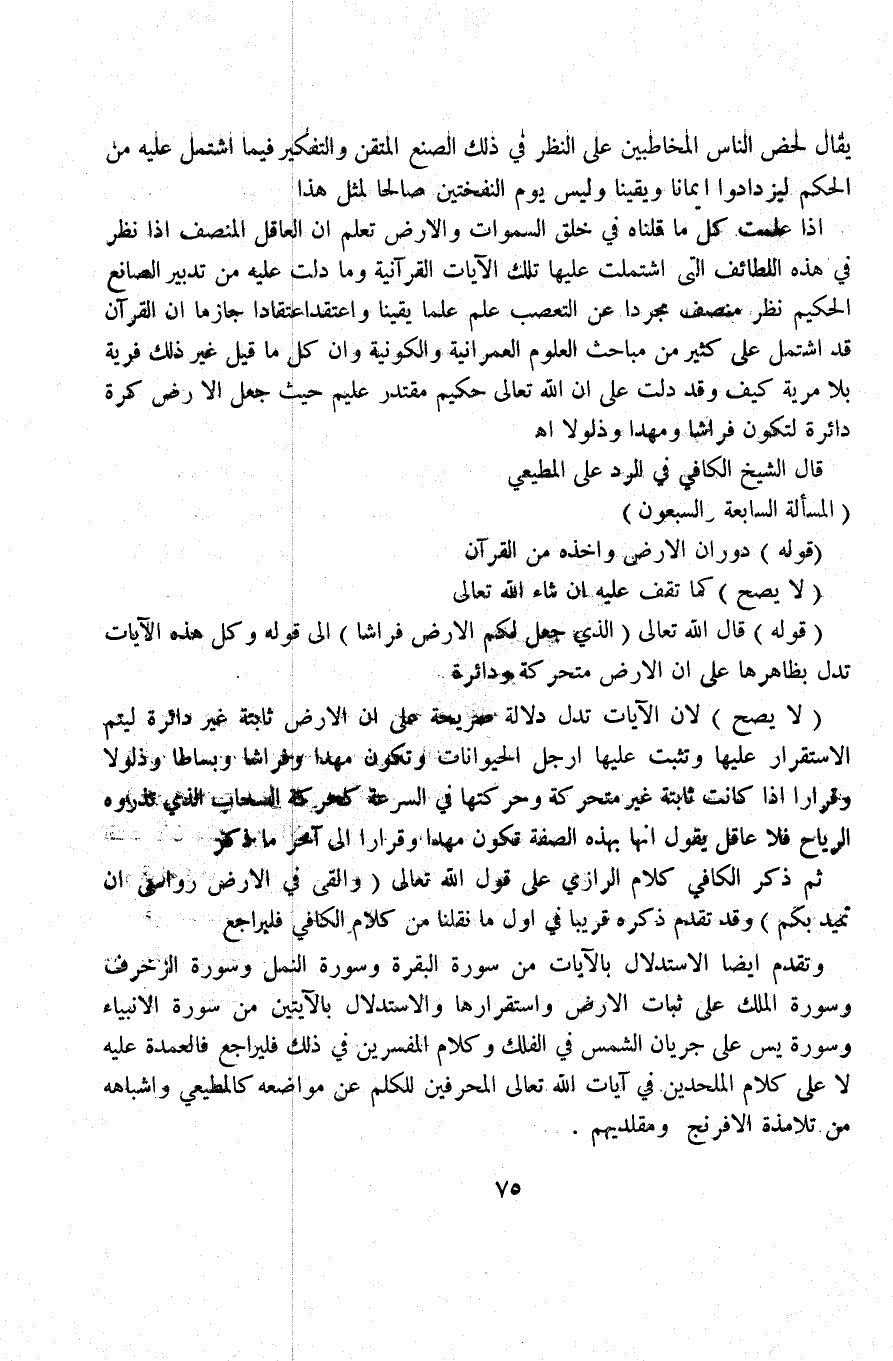 وتقدم أيضا الاستدلال بالآيات من سورة البقرة وسورة النمل وسورة الزخرف وسورة الملك على ثبات الأرض واستقرارها والاستدلال بالآيتين من سورة الأنبياء وسورة يس على جريان الشمس في الفلك وكلام المفسرين في ذلك فليراجع فالعمدة عليه لا على كلام الملحدين في آيات الله تعالى المحرفين للكلم عن مواضعه كالمطيعي وأشباهه من تلامذة الإفرنج ومقلديهم.