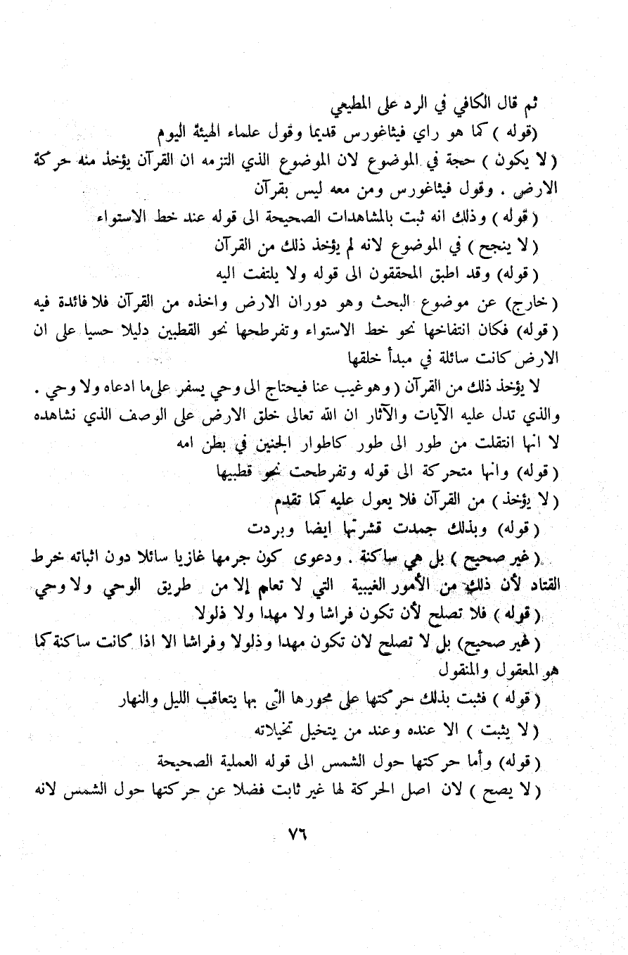 (لا يكون) حجة في الموضوع لأن الموضوع الذي التزمه أن القرآن يؤخذ منه حركة الأرض. وقول فيثاغورس ومن معه ليس بقرآن.
