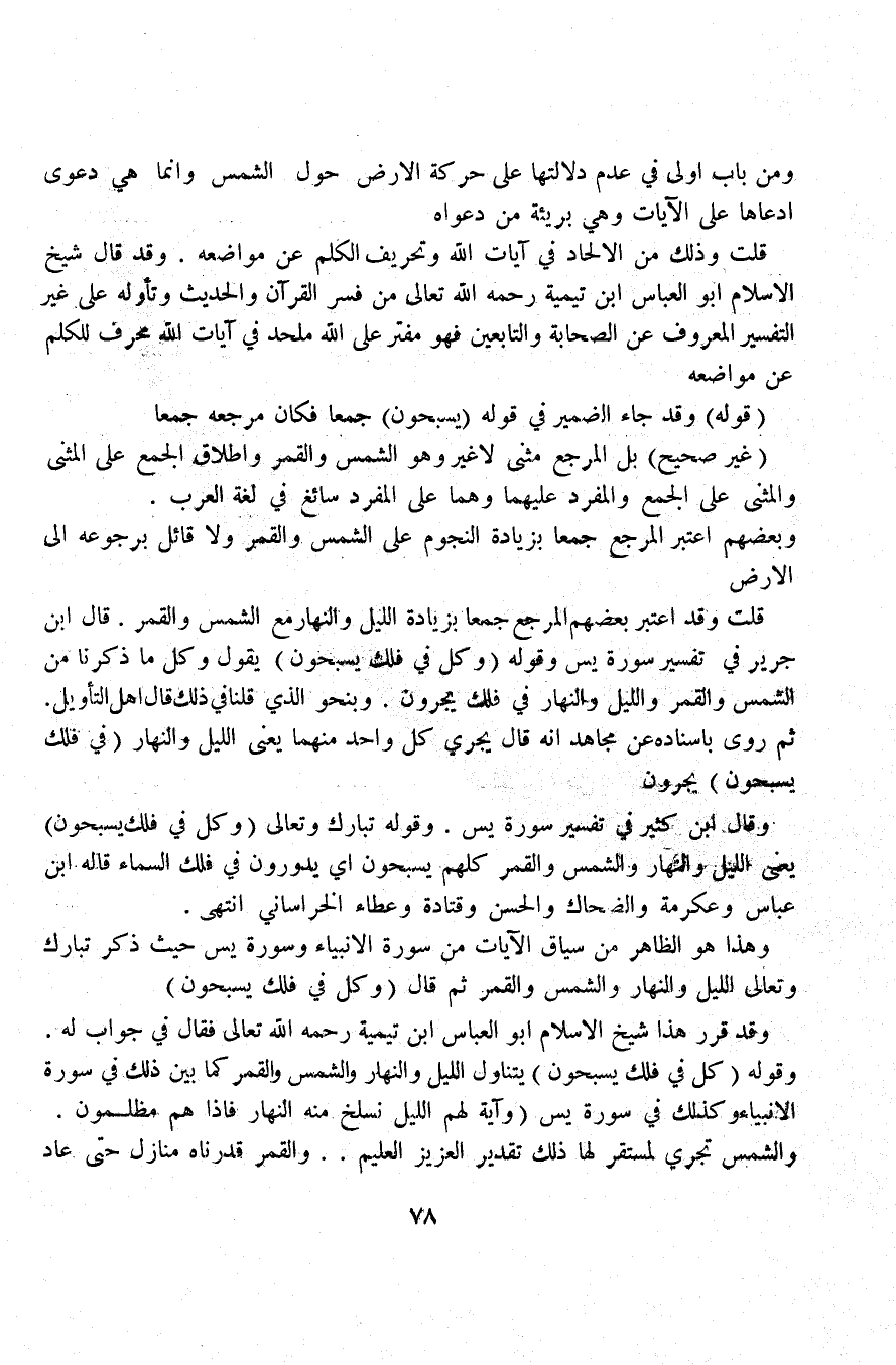 قلت وقد اعتبر بعضهم المرجع جمعا بزيادة الليل والنهار مع الشمس والقمر. قال ابن جرير في تفسير سورة يس وقوله (وكل في فلك يسبحون) يقول وكل ما ذكرنا من الشمس والقمر والليل والنهار في فلك يجرون. وبنحو الذي قلنا في ذلك قال أهل التأويل. ثم روى بإسناده عن مجاهد أنه قال يجري كل واحد منهما يعني الليل والنهار (في فلك يسبحون) يجرون.