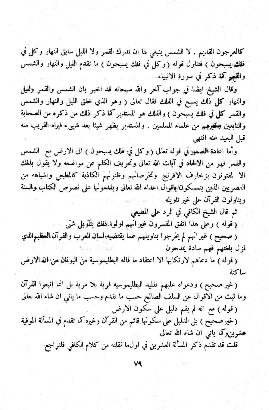 (غير صحيح) ودعواه عليهم تقليد البطليموسية فرية بلا مرية بل إنما اتبعوا القرآن وما ثبت من الأقوال عن السلف الصالح حسب ما تقدم وحسب ما يأتي إن شاء الله تعالى.